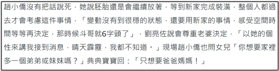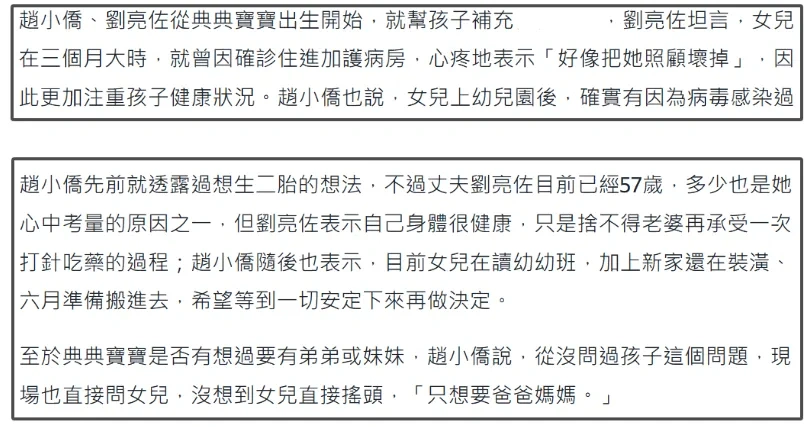 相比力愈发注重隐私的本地明星,港台明星聊起婚育话题向来大方,近来45岁台湾省女星赵小侨就当着媒体的面大方谈起了高龄追二胎的话题,不光透露了自身心情,还提到了一胎女儿和丈夫的态度,每一个人的反应都相当真实。 赵小侨出生于1979年11月,正处于年过四十岁又奔向五十岁的中心值,目前已经不怎么演戏了,成为了台娱圈范例综艺咖,一样寻常还会拍一拍视频展示家庭生活。 对于很多本地观众来说,赵小侨属于童年记忆的一部门,她和陈乔恩同是组合七朵花的成员,一起出演了经典偶像剧《王子变田鸡》,只不外相比力晚婚且46岁仍未生儿育女的陈乔恩来说,赵小侨观念更为传统,乃至可以说有些爱情脑。 ——在最好的年纪,赵小侨和大本身12岁的圈内人刘亮佐爱情,对方不光离过婚,尚有一个儿子,意味着赵小侨一完婚就要给人当后妈,但是赵小侨本人一点都不介意,对峙与刘亮佐爱情长跑6年之后完婚,之后就陷入了漫长的求子求女期。 完婚5年,4次采取科技本领,一次流产两次失败,打了上百次针打到脸肿,终于在年过40岁之后,赵小侨有了本身的孩子,她生下了一个可爱的女儿,取名叫做典典。 谁想到没过几年时间,履历了生养之苦的赵小侨竟然又萌生了生二胎的动机,而且就她和她老公刘亮佐身体状态看,大概率又要采取科技本领,那就意味着可能失败,到时间对于赵小侨的身心不免有所摧残。 还记得陈乔恩回应生养题目的时间,就提到过以她的年纪生小孩很伤害,赵小侨和陈乔恩是同龄人,观点和想法却完全不同,也是很有代表性了。 别的,不得不提的尚有赵小侨女儿以及她丈夫的态度。 赵小侨的女儿才2岁,但思维非常清楚,这一次赵小侨带着她到场活动,没有任何铺垫和预兆,上来就问小姑娘想不想要弟弟妹妹,2岁的小朋侪当下就摇头表现拒绝,直言只想要爸爸妈妈。 赵小侨57岁丈夫刘亮佐固然没有像女儿一样开口就拒绝,但话里话外的意思也很显着,他一边回想女儿出生3个月就进了加护病房,一边感慨本身年纪大了,又提到不想要妻子打针吃药,婉转提示赵小侨高龄追生二胎的风险性。 ——原来赵小侨都还没有和丈夫细致聊过二胎筹划,搞得对方一听到妻子想追二胎,都觉得是晴天霹雳,得知丈夫和女儿的态度之后,赵小侨好像有所动摇了,想到搞不好二胎生下来,丈夫都年过60岁了,只是对于女儿的拒绝,赵小侨照旧没当回事,只觉得是小朋侪喜好和大孩子玩,以是才不想要弟弟妹妹。 实在不管是陈乔恩的不生,照旧赵小侨的生了又想生,都不存在对错,婚姻与生养都是极其复杂的命题,每个人的情况不同,归根结底照旧要深图远虑,选择最恰当本身的方式就好啦。 本文未经授权严禁转载违者必究! |