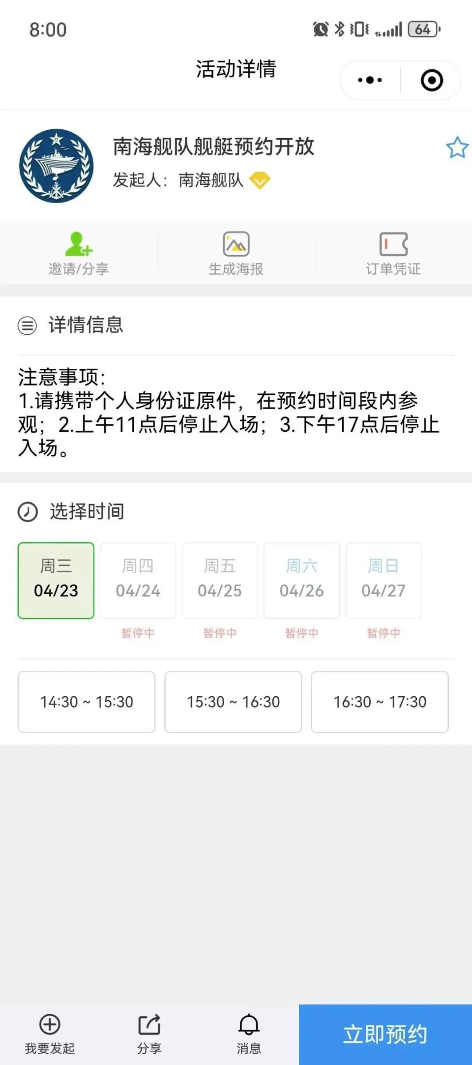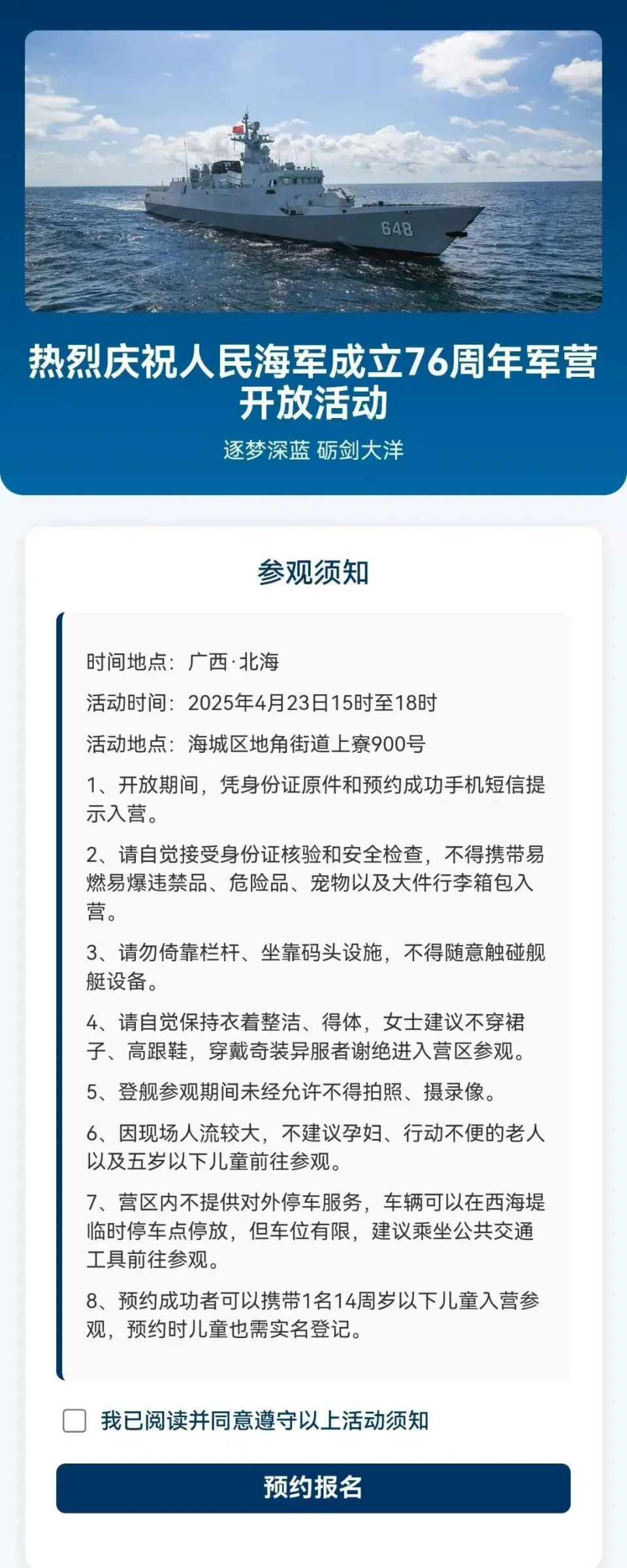 2.点击想要参加的都会,进入预约页面,按提示填报相干信息。 北海市页面 温馨提示 1.本次活动免费预约,线上预约接纳实名制,全部预约职员均以第二代居民身份证信息为准,每人限预约1次。 2.观光当日请携带个人身份证原件,在预约时间段内按指定门路进入港区观光。 3.观光期间,请自觉继承身份核验和安全查抄,不得携带易燃易爆违禁品、伤害品、宠物以及大件行李箱包登舰。 4.观光期间,请勿倚靠栏杆、坐靠船埠办法,不得随意触碰舰艇装备。 5.请自觉保持衣着整齐、得体,穿着奇装异服者推辞进入港区观光。(密斯请勿穿高跟鞋、短裙) 6.未经允许,不能照相。 7.观光期间,请自觉列队等候,保持良好秩序。 8.因现场人流较大,不建议孕妇、举措不便的老人以及五岁以下儿童前往观光。 9.如遇各类突发事故或港区内职员密度较大时,请服从现场工作职员指挥。 10.如活动地点不便停车,请只管乘坐公共交通前往。 |