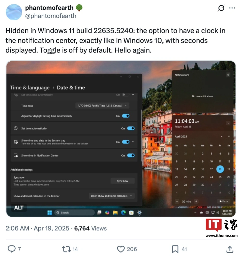 IT之家 4 月 20 日消息,微软在本年4月为Windows 10推出四月累积更新KB5055518,对使命栏日历弹窗布局进行修改,移除了弹窗中的时间信息。 固然Windows 10砍掉了这项特性,不外数据发掘者@PhantomOfEarth发现,微软将这项特性加到了 Windows 11上。 在Windows 11最新的Build22635.5240中,系统设置中已具有一项“在通知中心中添加时钟”按钮,点击按钮后即可在使命栏日历弹窗看到相应时间信息,其团体排版和Windows 10时期大抵雷同,只是字体有所调解。 只管Windows 11已经发布将近四年,但Windows 11的通知中心/日历弹窗在体验上仍然非常底子,为相识决这个问题,一些用户转向第三方应用来得到更多功能。 |
