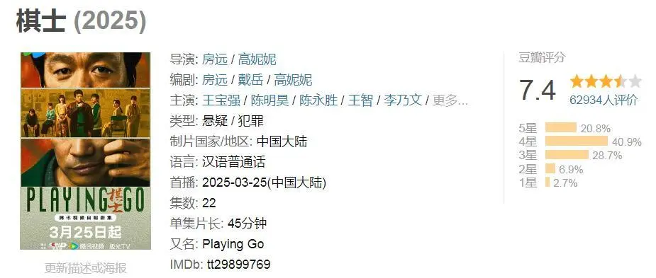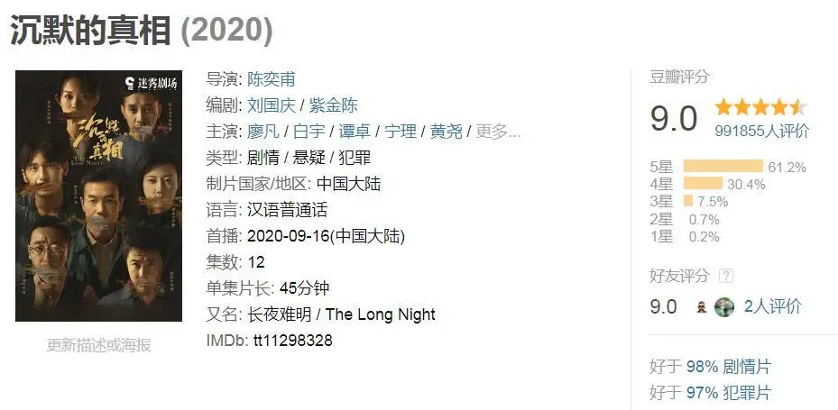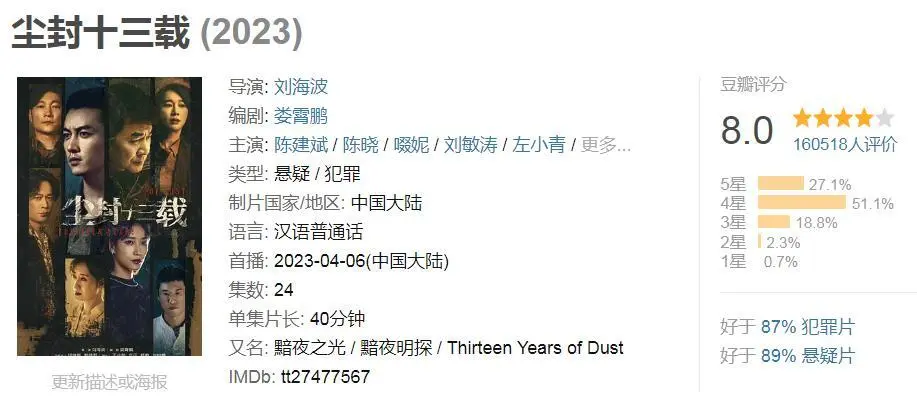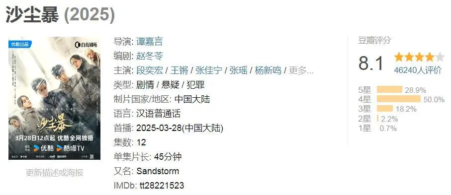 2025年的国产剧,停止到现在为止的结果一样平常。 可以大概称得上好的,一部是笑剧片《鹊刀门传奇》第二季,另有一部就是《沙尘暴》。 前者是笑剧片;但后者《沙尘暴》能拿下高分,就是源于其题材与演员表现了。 不外,这部已然是佳作的作品在近5年的国产犯罪悬疑剧中,连前三都排不进。 本日,番叔就跟各人聊聊近五年,八部口碑最好的犯罪悬疑佳作。 第八名:《棋士》(2025年,评分 7.4)这部剧在没上线之前,番茄君就很感爱好。 由于它大概是首部男主是反派的国产剧,假如硬是对比的话,它有点像《绝命毒师》,并且更真实。 剧中,王宝强饰演的围棋老师崔业,绝对是当下大多数中年夫君的真实写照:奇迹无成、婚姻破碎、生活窘迫...... 除却这些,在崔业身上另有着浓郁的“悲剧宿命”,不善言辞的他总是被排挤、被陵暴,无奈“屈从于人情调皮”却被卷入掳掠大案,想要过好平庸日子却又不得不由于儿子的渐冻症而孤注一掷...... 王宝强解释出来的崔业,更像是一个被生活欺压到断港绝潢的“赌徒”。这一点,立意上我以为比《绝命毒师》要好。 更值得一提的是,它加入了中国人的家庭关系,让剧情更加代入感。 好比:崔业与大哥崔伟的相处。 后者是典范的传统兄长情怀,为弟弟的围棋天赋让路、到处关心弟弟的生活,前者则是想要冲破兄长的光环,想要家里为自己骄傲一次。 但这种看似和谐的关系,却藏着诸多的矛盾,也成了崔业黑化的理由之一。 团体而言,《棋士》有爽感,且更多的是把关注点放在了人的身上。 尤其是剧中对崔业的全貌刻画,堪称精致。 好比:在学校被孩子们戏闹、要奖金被校长驳回后,他在洗手间的那一个眼神,足以彰显老实民气田中的“狠劲儿”与哑忍。 它并不是急着去让反派粉墨登场,而是构建了一个崩塌的过程,让脚色的张力更强。 这也是这部剧的魅力所在。 第七名:《猎罪图鉴》(2022年,评分 7.6)这部剧在2022年播出时,呈低开高走的状态。 剧作初次聚焦模拟画像师,接纳了“主线+单位案”的模式,讲述了沈翊、杜城携手追凶的故事。 双男主、单位剧、快节奏、映射实际......总之,这部剧的标签有很多,但无不说明它的取材很巧。 这部剧,是借助我们所认识的真实案件,加以改编,巧妙地刻画出人性。 好比:女性被侵的案件、孩子被拐、神仙跳等等。 每一个案件的背后,除了有实际原型,还讲述了案件背后的因由。 举个例子。 剧中有一个“操场埋尸”的案件,但它的本质却是由于性别辨认停滞所导致的一场悲剧。 固然,这部剧也不是没有瑕疵。 好比:檀健次饰演的沈翊,个人的侦查能力被“神话”。尤其是通过女儿的长相复原其生父的长相,这点多少就有点浮夸了。 不外,瑕不掩瑜,这部剧照旧值得一看的。 惋惜的是,它的续作并没有连续这部剧的好口碑,评分不如前作。 第六名:《摩天大楼》(2020年,评分 7.9)这是一部少有的以女性为视角的国产犯罪悬疑剧,其烧脑水平很高,再加上它接纳的是“脚本杀”模式,将脚色之间的各种纠葛构建成了一场罗生门。 对于喜欢悬疑题材的宝子们来说,这部剧无疑是一部“爽剧”。 首先它的故事叛逆很精良。 公寓中的一个女人钟美宝在一个停电的夜晚离奇殒命。随后三个嫌疑人先后上线,从公寓保安、两小无猜到中介,他们心田中都有自己掩藏的秘密。 别的,随着案情的不停推进,每个人的真实面目也在被一层层揭开,就连死者也不是众人眼中的“傻白甜”。 因此,剧中的反转特殊多。 除了剧情之外,《摩天大楼》的女性视角在国产剧中也是少有的优秀。 好比:关于大众对美丽女生的惯用眼光。 另有女性受到伤害时的“受害者有罪论”。 正因云云,剧中所显现出来的女性气力才气格外地感动人。 第五名:《尘封十三载》(2023年,评分8.0)一部标准的双线并行的犯罪悬疑剧,围绕着一起高出十三年的命案睁开。 对比之前的悬疑剧作,这部剧就显得非常“老实”。 没有神乎其神的探案手法,也没有灵光乍现,主角团破案全靠“摸排走访”,在每一个与案件有关的人物身上找寻突破口。 好比:剧中,陆行知调查死者身份是根据其风雅的美甲,再通过尸检陈诉上的信息,在市里较高档的美甲店查到的。 这种抽丝剥茧的查案方式,在给予观众真实感的同时,也让各人感受到独属于谁人年代配景下警员的办案方式。 值得一提的是,这部剧中陈建斌、陈晓贡献出了出色演技。 尤其是两次与徒弟在车上分析案情的状态对比,把一个老刑警从已往的老派、固执到履历光阴后的柔和、包涵给显现得淋漓尽致。 而陈晓则是与之恰恰相反。 从最开始的稚嫩,到13年后的老练,师徒之间这种巧妙的对调,增长了剧作的意见意义性,也让观众看到光阴对其的沉淀。 第四名:《沙尘暴》(2025年,评分 8.1)这大概是2025年开年后,口碑最好的一部国产剧,且险些是在零宣传的环境下上线,然后一起走高。 12集的体量,别看不大,但都是精华。 故事围绕着发生在西北的一起锅炉焚尸案睁开,死者是本地的一名寡妇,为求生存,她曾做过违法的事。 可没想到却被焚烧致死,而嫌疑人一共有三人,此中丁宝元俯首认罪,但在八年后,他却不停申说表现自己并没有罪。 随即,老刑警陈江河(段奕宏 饰)携手市局刑警罗英玮(张瑶 饰)睁开调查。 一场有关于“全员恶人”的案件原形,即将被扒开。 说实话,这部剧有着很强的映射性,好比熟人社会、交际闭塞