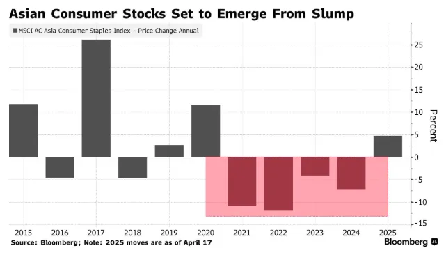 财联社4月21日讯(编辑 潇湘)多家华尔街机构近期表现,环球贸易战正为亚洲消耗股带来利好,因投资者有望涌入那些迎合当地消耗者基本需求的公司寻求掩护。 高盛和摩根士丹利的战略师们在4月2日关税大战后发布的陈诉中均保举了亚洲必须消耗品板块,敦促投资者转向防御。而富达国际则更是明确表现,该公司买入了此前遭受打击的中国消耗类股,押注这些公司将受益于刺激政策。 自4月2日以来,MSCI亚太必须消耗品指数已上涨了5%,是11个板块中表现最好的,其表现远远凌驾了大盘基准指数同期2.5%的跌幅。在此期间,中国连锁超市永辉超市和日本神户物产株式会社的涨幅曾一度高达逾19%,其他一些饮料和乳制品生产商也表现不俗。 盛宝市场新加坡首席投资战略师Charu Chanana表现,这种超预期表现预示着“投资者心态的转变,从追逐环球增长和出口转向寻求内需弹性的掩护”。 “投资者开始对一个更加分散、掩护主义盛行的天下举行订价,在这个天下里,地方政策支持和消耗更为紧张”,Chanana指出。 只管旷日恒久的贸易战鲜有行业能幸免,但必须消耗品板块在经济承压时期往往能显现出韧性。而亚太市场上这一板块眼下的另一个利好因素是:与MSCI亚太信息科技指数自2019年以来基本不中断的多年上涨相比,必须消耗品板块在2024年之前已连续四年下跌,这也表明该板块有着巨大的追赶空间。 轮动料将连续 随着诸多财务刺激操持的公布,新一轮轮动大概会连续。 中国政府迩来列出了多项步调,以刺激家庭在餐饮和医疗保健等方面的支出,而韩国则将增补预算操持进步到12万亿韩元(84亿美元)。在印度,高于正常程度的季风预告也有望提振农村需求。 富达国际客户投资组合战略师Terrence Kan表现,富达国际已使用4月7日A股和港股回落的机会,增持了必须消耗品及部门旅游干系可选消耗股。同时,他如今更为青睐于在中国当地上市而非香港上市的股票,由于它们大概从政府方面的支持步调中获益更多。 而在当前这段市场动荡时期,亚洲消耗类股的表现也好于美国和欧洲的同类股票,这要归功于当地政策支持的迅速答应。 高盛战略师在4月6日陈诉中已将对亚洲必须消耗类股的评级从市场权重上调至超配,称这些股票更倾向于 “内需与防御性”。摩根大通战略师上周四对东南亚市场的该板块也接纳了雷同操纵。 Tokio Marine Asset Management首席投资官Hironori Akizawa表现:“必须消耗品不是一个需求颠簸很大的行业,对美国出口敞口较大的公司相对较少。一个积极的情况是,各国央行将接纳降息步调,刺激消耗。” 相比之下,由于市场预期家庭将淘汰非必要开支,可选消耗品股票收到的打击要更为显着。MSCI亚太可选消耗品指数自4月2日以来已下跌逾5%,跌幅位居各行业第二。 安本投资亚洲股票高级投资总监James Thom表现,必须消耗品板块的一个风险是通胀再度仰面,这大概抑制市场热情。 不外如今市场正在形成共识:必须消耗品是更为安全的押注。将来12个月,该板块的红利增长将是MSCI亚太指数的两倍。 AT Global Markets悉尼首席市场分析师Nick Twidale以为,“在当前情况下,必须消耗品仍将是投资者关注核心。若风险偏好回归,资金大概重新转向可选消耗和服务业板块。但我以为这需要美国在关税题目上转变立场才气实现。” |
