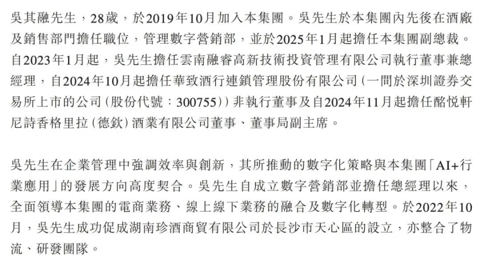 近期,珍酒李渡(HK:06979)发布高管人变乱动公告,执行董事吴光曙盼望专注于个人事件,将于5月9日的股东周年大会竣事时退任。与此同时,28岁的吴其融出如今公司新执行董事的提名名单中。 吴其融是珍酒李渡董事长吴向东的儿子,若此次通过提名,其将有望在父亲掌舵的两家上市公司继续董事。 这位95后“酒二代”正渐渐走向权力中心。 作为业内的“白酒教父”,深耕行业30年的吴向东,白酒帝国版图庞大,其不但建立了“金六福”品牌,还先后带领华致酒行(SZ:300755)成为A股“酒类流畅第一股”,并通过收购、参股数十家白酒企业,整合成立珍酒李渡公司,推动其登岸资源市场。 吴其融从英国伯明翰大学结业后,已全面进入父亲的白酒业务中。 企查查信息显示,其在湖南金东酒业、华泽团体、华致酒行等5家公司任董事或法人,并已实质性到场企业管理。吴其融2019年10月加入珍酒李渡,先后在酒厂及贩卖部门继续职位,管理数字营销部,今年1月正式出任公司副总裁。 这位年轻的“酒二代”走向权力中心,受到业内广泛关注。 中国酒业分析师蔡学飞以为,“酒二代”以职业司理人的方式交班,让年轻高管从生产、贩卖到战略全面历练,克制“空降式”晋升引发的构造排挤,生存眷属控制权,符合当前酒企传承趋势。 其增补道,吴其融具有国际化辅导配景,特殊是在盘算机与数字化方面有着一定上风,并在酒厂轮岗积年,熟悉各个岗位内容与管理,对于珍酒李渡的数字化、年轻化转型都有积极价值。 迩来几年,酒企纷纷将品牌年轻化、培养年轻消耗者作为紧张战略,高管年轻化已经成为新趋势。 贵州茅台新董事长张德芹、五粮液新任总司理华涛、习酒团体董事长汪地强都是70后;1987年出生的郎酒“少帅”汪博炜2023年上任公司总司理一职。 95后的吴其融身上自带诸多光环,但客观来看,其所面临的白酒行业与父辈创业时期截然差异。 白酒行业正处于深度调解期,客岁酒企业绩广泛承压。 财报显示,珍酒李渡2024年营业收入约70.67亿元,同比增长0.5%,增速为上市以来最低;股东应占利润约13.24亿元,同比淘汰43.1%。吴向东资源版图下的另一上市公司华致酒行作为卑鄙公司受到了更大影响,2024年公司实现营收94.64亿元,同比下滑6.49%;归母净利润0.44亿元,同比降落81.11%。 面临复杂的行业环境,这位年轻的“酒二代”任重道远。 记者 水芙蓉 文字编辑 左宇 版面编辑 孙霄 |