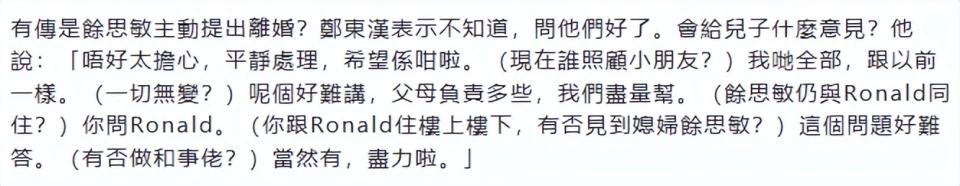 53岁郑中基克日被传两度仳离,与二任妻子余思敏的14年婚姻走到尽头,他几天前现身香港家事法庭,被曝打仳离官司争取子女抚养权。 4月22日,港媒爆料郑中基和余思敏的仳离官司未能告竣息争,缘故原由是郑中基每个月仅付出8000元港币抚养费,难以付出一对子女的学费、补习班、等一样平常开支,两人无法告竣共识,只能闹上法庭。 消息曝光后,郑中基被吐槽太抠门,幸亏阿Sa当年实时阔别。 4月22日,余思敏好友郑文担当港媒采访,澄清余思敏从来没有给媒体爆料,也没有向报道所说的“曾向朋侪透露本相”,她没有从余思敏口中听过官司的本相。 好友夸大余思敏没对她说过,她完全不知情,不清晰媒体为什么知情,透露余思敏正在用心照顾小朋侪。 好友末了一句“照顾小朋侪”,好像暗示余思敏拿到了子女抚养权,但爆料的港媒曾拍到郑中基接送儿子放学的视频,可见子女抚养权并非余思敏独有。 视频中,儿子和郑中基关系融洽,牵着父亲的手蹦蹦跳跳,并未由于父母闹仳离而影响心情。 港媒指出郑中基近照暴瘦,面目面貌干瘪,工作之余抽闲接儿子放学,儿子看到父亲后很开心,也阐明郑中基不是一个失职的父亲。 TVB数日前曾拍到郑中基现身家事法庭,被问到是否打仳离官司,他反问记者为什么知道?暗示有人将此事泄漏。 而这一次,港媒声称知恋人爆料,余思敏向友人控诉,郑中基只给八千抚养费,根本不敷子女的开销,再次内涵余思敏的“泄密者”。 或因如此,闺蜜郑文才担当采访澄清,否认“泄密者”是余思敏以及自己。 据港媒报道,余思敏完婚后相夫教子,险些没有收入,过着手心向上的生活,名下没有任何财产,婚内居住的6500万豪宅不绝挂在公公郑东汉名下,假如没有房子住的话,8000块在香港只能租个小房子,根本不敷抚养2个小孩,也有传是一个孩子八千,两个小孩一个月抚养费是一万六。 据悉,郑中基客岁由于和经纪人走得太近掀起婚变风波,他第一时间辞退经纪人,又以抑郁症复发为由到美国戒酒半年,但知恋人体现效果不大,夫妻分居半年后关系降至冰点,郑中基不想放下工作去美国,两人关系破裂后决定仳离。 有传郑中基和经纪人何庆湘固然结束相助关系,但没有完全断联,因此激怒余思敏。 |