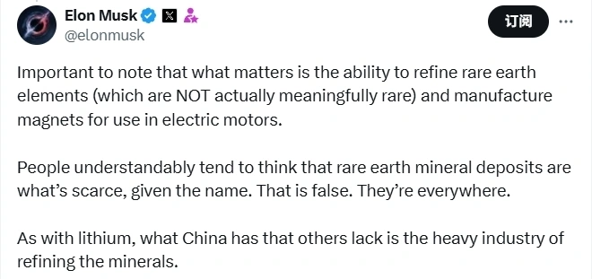 【文/观察者网 阮佳琪】 4月初,在特朗普政府对中国无理加征所谓“对等关税”后,中方敏捷出台反制“组合拳”,除关税本领外,还对钐、钆、铽、镝、镥、钪、钇等7类中重稀土干系物项实行出口管制,精准反击。 现在,特朗普射出的子弹,正中他的密切盟友——马斯克的眉心。 据彭博社、路透社等23日报道,当地时间周二(22日),马斯克在特斯拉的第一季度财报电话集会上透露,该公司人形机器人“擎天柱”(Optimus)的生产,受到了中国对稀土磁体出口限定的影响。马斯克称,中方希望特斯拉包管其从中国得到的稀土磁体不被用于军事目标。 据美媒引述的内容,马斯克说:“我们正在与中方就此事进行沟通调和。希望可以大概得到利用稀土磁体的出口允许。中方希望得到一些包管,确保这些稀土磁体不会被用于军事目标。这显然不会。这些磁体只会被用于(生产)人形机器人。” 稀土是高科技财产不可或缺的质料,全球约90%的供应和精炼加工来自中国。美国有70%的稀土产物依靠中国入口,此中重稀土的依存率更是高达92%,这让美国在应对中国出口管制时显得被动。 尽管美欧和澳大利亚都在积极建立替代供应链,但中国此前还严格管控了稀土加工和制磁技能出口,这些办法短期内大概会进一步拦阻西方扩大稀土财产的积极。 彭博社指出,作为迄今为止最受瞩目标稀土磁体买家之一,特斯拉明白指出了中方这一政策厘革所带来的直接影响。 毕竟上,在中方刚颁布出口限定政策之际,马斯克便已婉转表达过担心。 他在社媒X上转发了一则介绍中方反制步伐的帖文,并附文称,“须要夸大的是,真正关键的是提炼稀土元素以及制造用于电动机的磁体的本领。和锂的情况一样,中国拥有而其他国家所短缺的,是可以大概对这些矿物进行提炼的重工业气力。”
