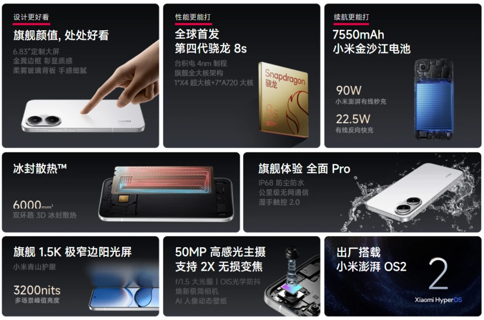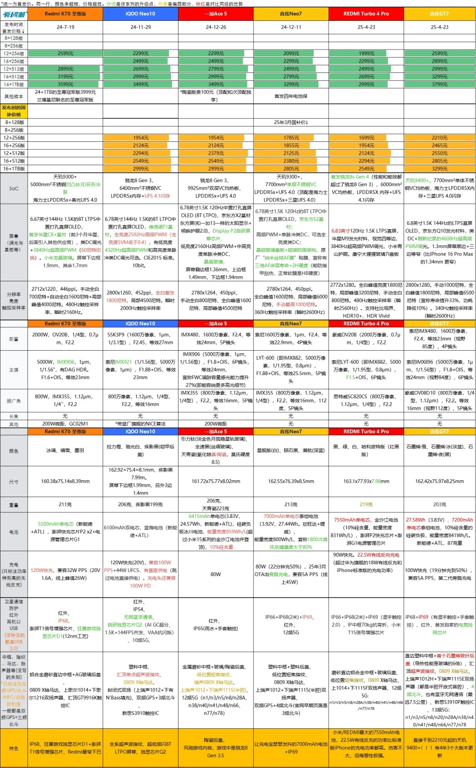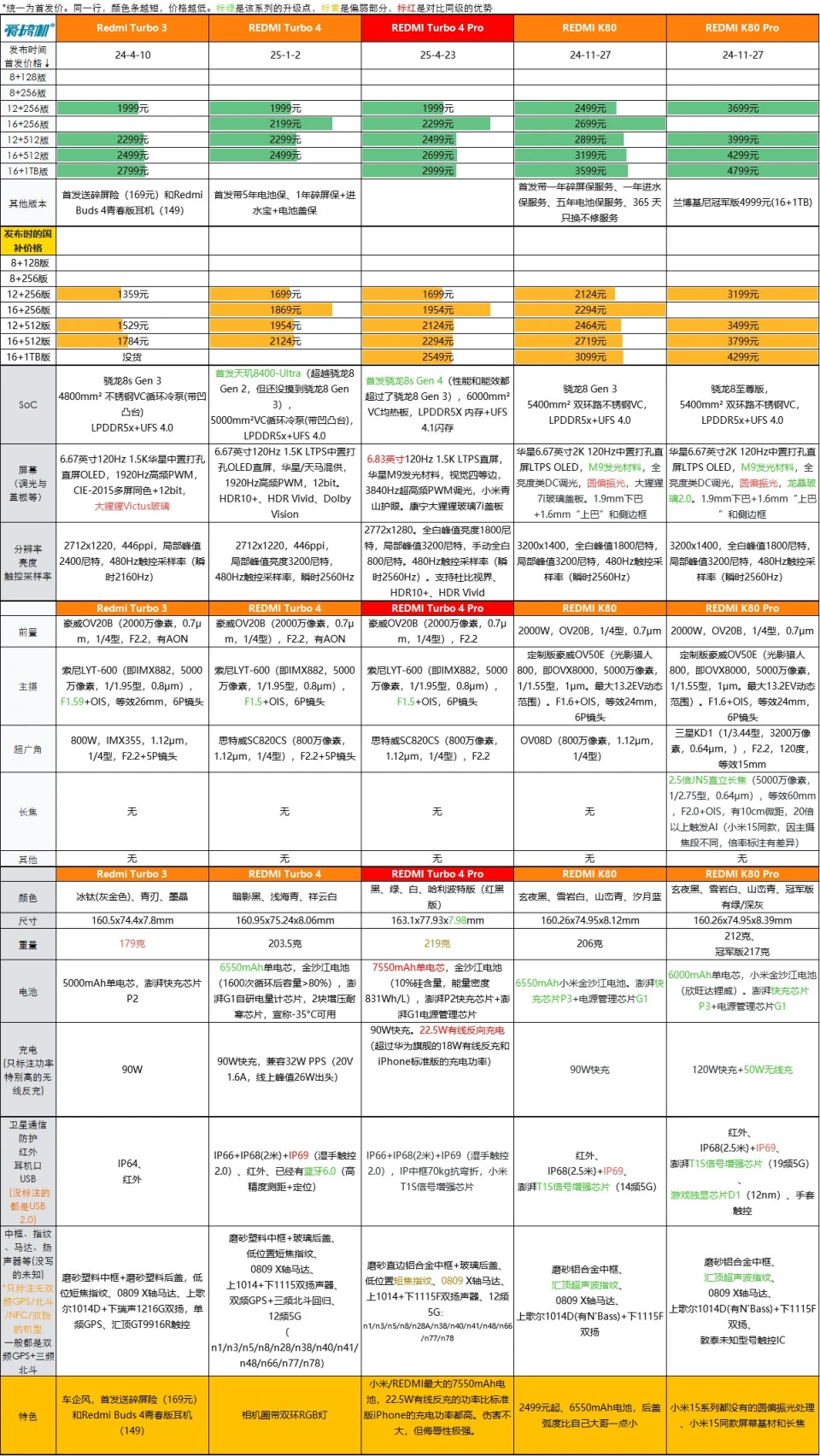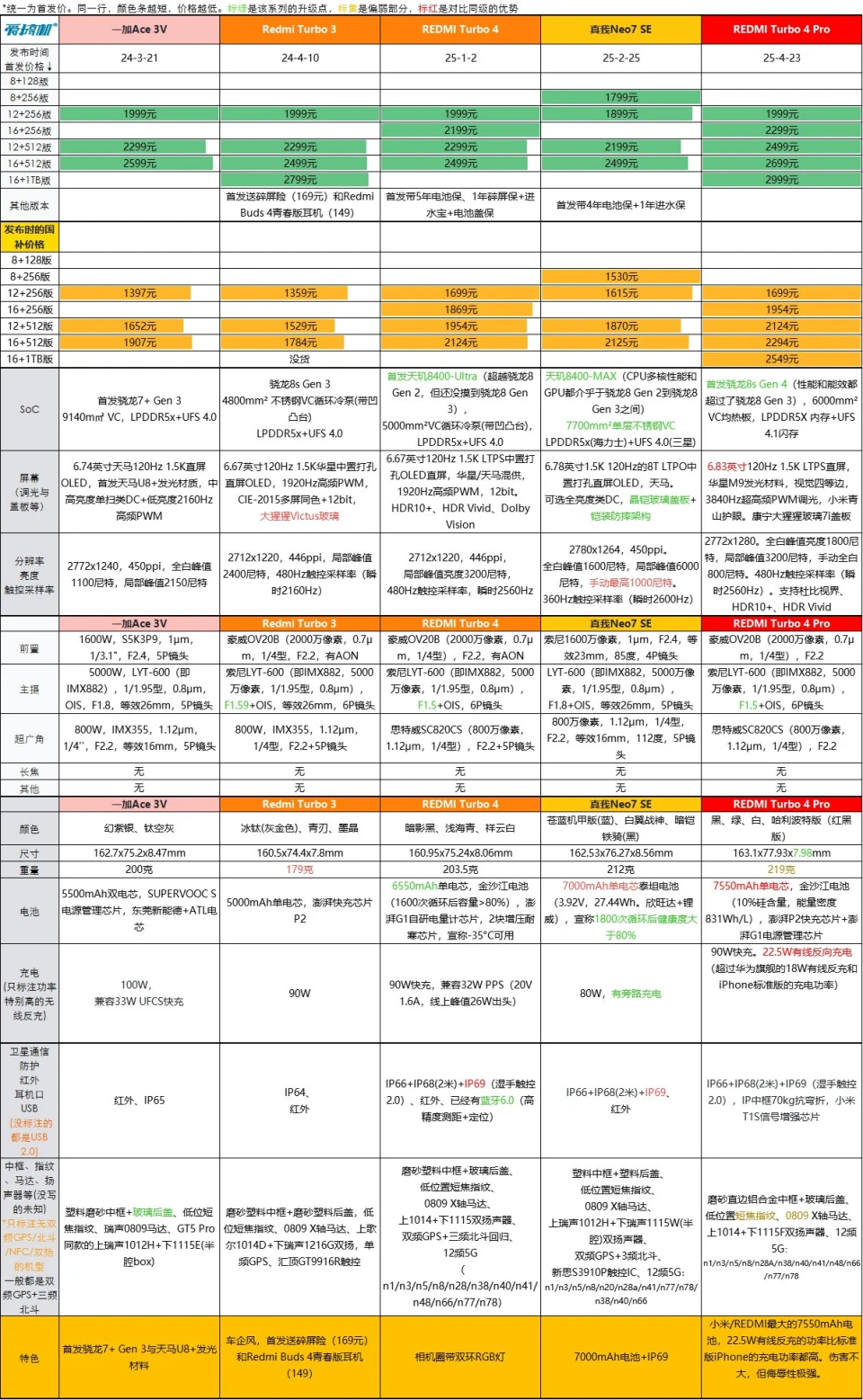 2025年4月23日,REDMI Turbo 4 Pro正式发布。REDMI Turbo 4 Pro省流就是首发骁龙8s Gen 4(比骁龙8G3更强)、有小米/REDMI最大的7550mAh电池、有高达22.5W有线反充、有金属中框和6.83英寸大直屏。 REDMI Turbo 4 Pro定了个和Turbo 4很接近的代价(入门版同价,中高配贵了100到20元): - 首发代价12+256版1999元,16+256版2299元,12+512版2499元,16+512版2699元,16+1TB版2999元; - 国补代价12+256版1699元,16+256版1954元,12+512版2124元,16+512版2294元,16+1TB版2549元。 发布会后一小时,REDMI Turbo 4 Pro就已经逾越Turbo 4首销全天销量。两台机器,性能相差凌驾一代、Pro版电池更大、多了金属中框,发布价只差0到200元。 REDMI Turbo 4 Pro的具体信息: 【性能、电池与快充】 REDMI Turbo 4 Pro是首发骁龙8s Gen 4(性能和能效都凌驾了骁龙8 Gen 3),6000mm VC均热板,LPDDR5X 内存+UFS 4.1闪存; 7550mAh单电芯,金沙江电池(10%硅含量,能量密度831Wh/L),汹涌P2快充芯片+汹涌G1电源管理芯片; 90W快充,支持22.5W有线反向充电(凌驾华为旗舰的18W有线反充和iPhone标准版的充电功率)。 【屏幕】 6.83英寸120Hz 1.5K LTPS直屏,华星M9发光质料,视觉四等边,3840Hz超高频PWM调光,小米青山护眼。康宁大猩猩玻璃7i盖板; 2772x1280。全白峰值亮度1800尼特,局部峰值3200尼特,手动全白800尼特。480Hz触控采样率(瞬时2560Hz)。支持杜比视界、HDR10+、HDR Vivid。 【相机部分】 前置是豪威OV20B(2000万像素,0.7μm,1/4型),F2.2; 主摄是索尼LYT-600(即IMX882,5000万像素,1/1.95型,0.8μm),F1.5+OIS,6P镜头; 超广角是思特威SC820CS(800万像素,1.12μm,1/4型),F2.2; 【周边配置】 REDMI Turbo 4 Pro有黑、绿、白、哈利波特版(红黑版)等配色; 机身尺寸163.1x77.93x7.98mm;219克重。 有IP66+IP68(2米)+IP69(湿手触控2.0),IP中框70kg抗弯折,小米T1S信号增强芯片; 磨砂直边铝合金中框+玻璃后盖、低位置短焦指纹、0809 X轴马达、上1014+下1115F双扬声器、12频5G:n1/n3/n5/n8/n28A/n38/n40/n41/n48/n66/n77/n78。 末了例牌,【REDMI Turbo 4 Pro】与一加Ace 5/Ace 3V、真我Neo7/Neo7 SE/GT7、iQOO Neo10、REDMI Turbo 3/4对比↓(骁龙8s Gen 4强于骁龙8 Gen 3,但Turbo 4 Pro又回到了Turbo 4的代价区间,导致它同时成为骁龙8 Gen 3/天玑9300机型、天玑8400/骁龙8s Gen 3机型的竞品)。 |
