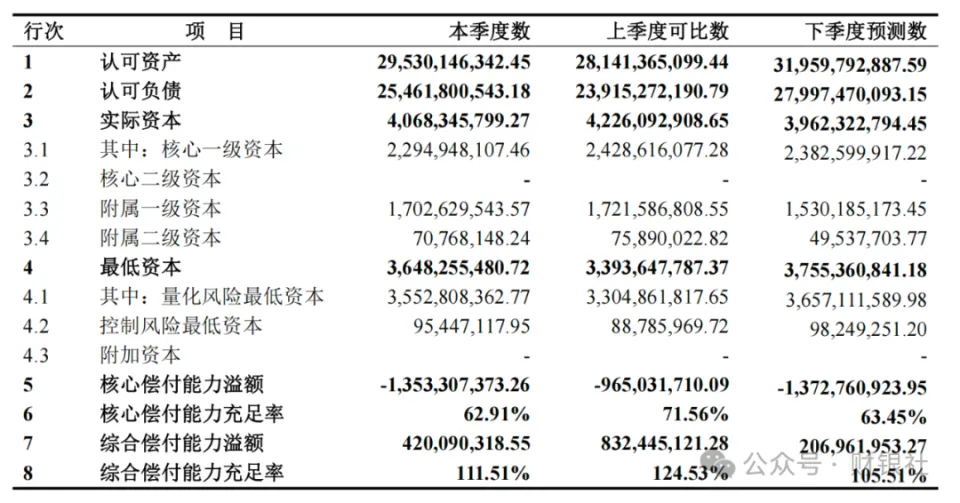 偿付本领指标的下滑敲响了资源富足性的警钟四序度末焦点偿付本领富足率62.91%,较上季度下降8.65个百分点,逼近50%的羁系红线;综合偿付本领富足率111.51%,同比下降13.02个百分点,重要归因于实际资源淘汰1.58亿元与最低资源增长2.55亿元的双重挤压。