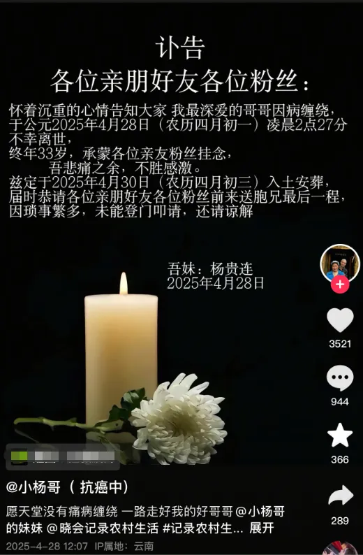 4月28日,33岁抗癌博主 “小杨哥” 杨贵成病逝,其妹妹在外交平台发布了讣告,透露他于2025年4月28日破晓2点27分去世,葬礼将于4月30日举行。“小杨哥” 来自云南昭通,因用短视频记载本身的抗癌履历,引发网友关注。4月29日,“小杨哥” 的妹妹杨密斯透露,哥哥患 “脑癌” 于4月28日破晓去世,年仅33岁。目前,家人正在为其处理后事。 本年33岁的 “小杨哥” 来自云南昭通的农村家庭。杨密斯先容,2023年4月,哥哥不停出现头晕的症状,先后到多家医院查抄,都没查出具体病因。2023年7月,“小杨哥” 到四川大学华西医院治疗,终极被确诊为胶质母细胞瘤4级。“这是一种‘脑癌’,医生说这是一种很严肃的疾病,治愈率很低。” 杨密斯说,哥哥从确诊到去世仅2年,“太伤心了!” 杨密斯先容,哥哥确诊后,家人不停没有放弃,多次到昆明、成都的医院治疗,与病魔作斗争。只管云云,他依然保持着乐观的心态,并开通了短视频账号,给本身取网名为 “小杨哥”,他和妹妹一边记载抗癌之路,一边记载家庭一样平常。很多网友被他的故事触动,纷纷留言鼓励他克服病魔。 “哥哥有一个11岁的女儿,他和嫂子多年前就离婚了。作为一个单亲爸爸,把女儿拉扯大也很辛苦。” 杨密斯先容,自从哥哥抱病后,重要靠父母及两个妹妹照顾,“他女儿很懂事,每天放学回家都会照顾爸爸。” 在 “小杨哥” 账号发布的短视频中,其女儿乖巧懂事,常常照顾抱病的父亲,感动了很多网友。 杨密斯先容,哥哥去世之前不停流眼泪,他最放不下的就是女儿。“他强撑着末了一丝气力,终于等到女儿放学回家。当女儿看了他末了一眼,他才徐徐闭上双眼,带着不舍与挂念,永久地离开了这个世界。” 杨密斯哽咽着表现,哥哥走了,侄女这两天不停哭,看得令人揪心,“我们百口一定会把孩子好好养大。” |