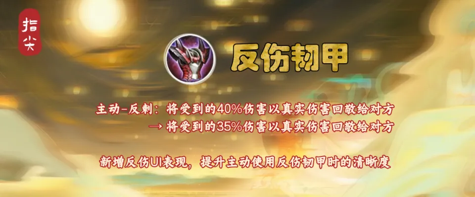 别的现在增强了ui的体现,开启反伤韧甲后,血条、字条和身边的红光增长了更亮的提示,乱战中可以更清晰的看到对头是不是开了反伤效果。