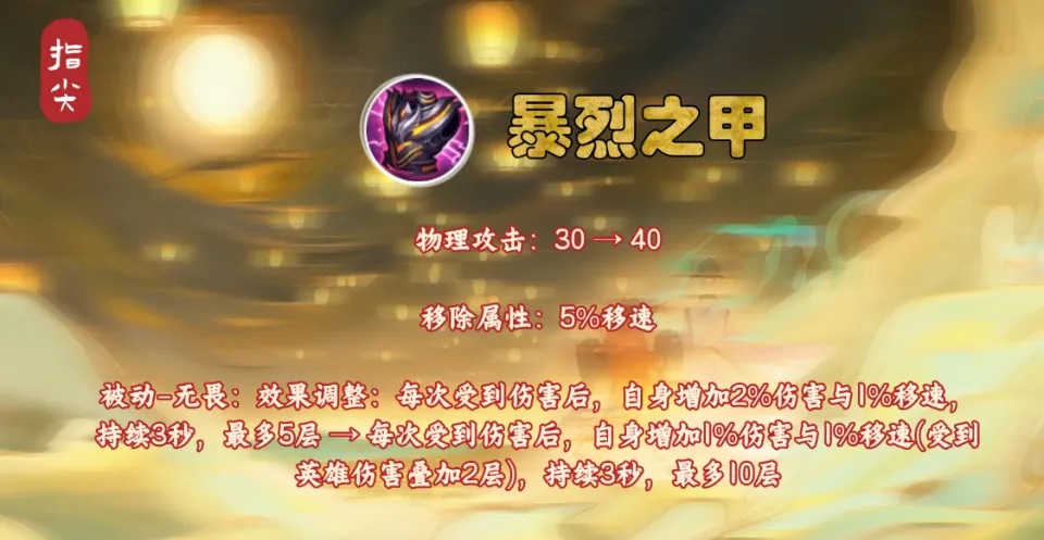 还记得最初的暴烈之甲吗?无人问津,常年被荒凉,只有被动的增伤效果和受击移速,在20年的9月份一次调解,给它新增了5%的移速后,有了和反伤刺甲分庭抗礼的资源,但同时被动的移速也从每层2%低沉到了1%,相称于让5%的移速常驻,但出场受击仍旧有机动性的提拔。