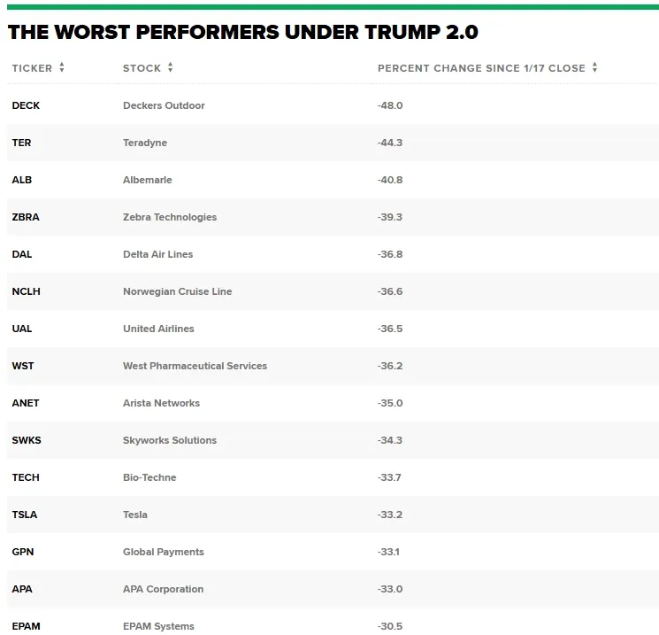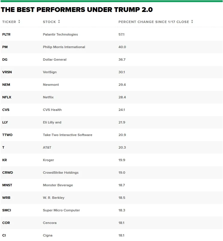 自从总统特朗普回归白宫以来,一些股票履历了剧烈颠簸。 特朗普提出的一些筹划——比如征收关税和减少联邦政府支出——引发了投资者鉴戒,也对市场造成了巨大影响。标普500指数有望录得自尼克松上世纪70年代第二任期以来,总统任期前100天内最糟糕的体现。 但在指数表面之下,一些股票却出现了异乎寻常的剧烈颠簸。CNBC筛选了标普500指数,看看自特朗普今年1月重返白宫以来,哪些股票体现最亮眼,哪些则跌得最惨。为此,CNBC利用了特朗普就职前谁人星期五的收盘价作为比力基准。 体现最差的股票 Deckers Outdoor(DECK)是跌幅最大的股票,在这一期间暴跌了48%,领跌标普500指数。 这家生产Ugg和Hoka的公司因投资者担心特朗普筹划对进口商品征收关税,从而打击公司利润,股价遭到重创。Evercore分析师Jesalyn Wong本月早些时间告诉客户,Deckers的大部分制造业务大概位于中国和越南。 只管近期体现不佳,华尔街广泛预计该公司将出现反弹。根据LSEG的观察,分析师广泛给予该股“买入”评级,匀称目的价预示着约莫67%的上涨空间。 Tesla(TSLA)也是遭受重创的股票之一,股价在这100天内下跌了约三分之一。除了关税担心,公司还因CEO马斯克对特朗普竞选活动的支持以及向导有争议的政府服从改革项目(DOGE)而遭遇抗议。 Baird分析师Ben Kallo上个月对CNBC体现:“当人们的汽车有被划伤乃至被点火的风险时,纵然是支持Musk或对他无感的人,也大概会三思而后行是否还要买特斯拉。” 只管LSEG的大多数分析师仍给予该股“买入”评级,但匀称目的价表现,将来一年内该股的体现大概持平。 航空公司Delta(DAL)和United(UAL)也榜上有名,两家公司股价均下跌逾36%。 随着斲丧者信心下滑,投资者开始猜疑在预期阑珊的背景下,航空业是否将出现需求回落。航空公司正面临下半年需求疲软的局面,并开始通过打折促销来刺激预订。 别的,交易业务员也担心政府减少支出和企业缩减差旅预算会进一步打击商务观光。 只管近期股价低迷,华尔街仍看好其将来体现。根据LSEG数据,分析师广泛给予这两只股票“买入”评级,目的价表现将来上涨空间超过30%。 体现最好的股票 只管大盘体现低迷,一些股票仍逆势上涨。 Palantir(PLTR)在此期间领涨标普指数,股价飙升超过57%。而在去年,这家炙手可热的国防科技公司就已是体现最好的股票之一。 这只受到散户青睐的股票被视为“特朗普交易业务”之一,未受到因关税引发的股票抛售影响。公司高管体现,他们以为马斯克和特朗普推动的政府服从改革项目DOGE对公司业务是有利的。 Palantir技术主管Shyam Sankar在2月的财报电话集会中体现:“我以为DOGE将为政府带来精英治国和透明度,而这正是我们贸易业务的核心所在。” 不外,华尔街在该股大涨之后保持审慎。LSEG数据表现,分析师广泛给予该股“持有”评级,目的价暗示将来一年大概下跌近18%。 Netflix(NFLX)也是体现精彩的公司之一,其股价上涨超过28%。由于其业务性子,公司险些未受到关税影响。 不外,在大涨之后,分析师以为上涨空间有限。固然LSEG观察的大多数分析师给予“买入”评级,但匀称目的价表现将来上涨幅度不到2%。 别的,一些防御型股票也体现优异。烟草巨头Philip Morris(PM)飙升40%,电信股AT&T(T)上涨超过20%。 LSEG的大多数分析师对这两只股票也都给予“买入”评级。Philip Morris的匀称目的价表现尚有近2%的上涨空间,而AT&T的则约为3.6%。 |