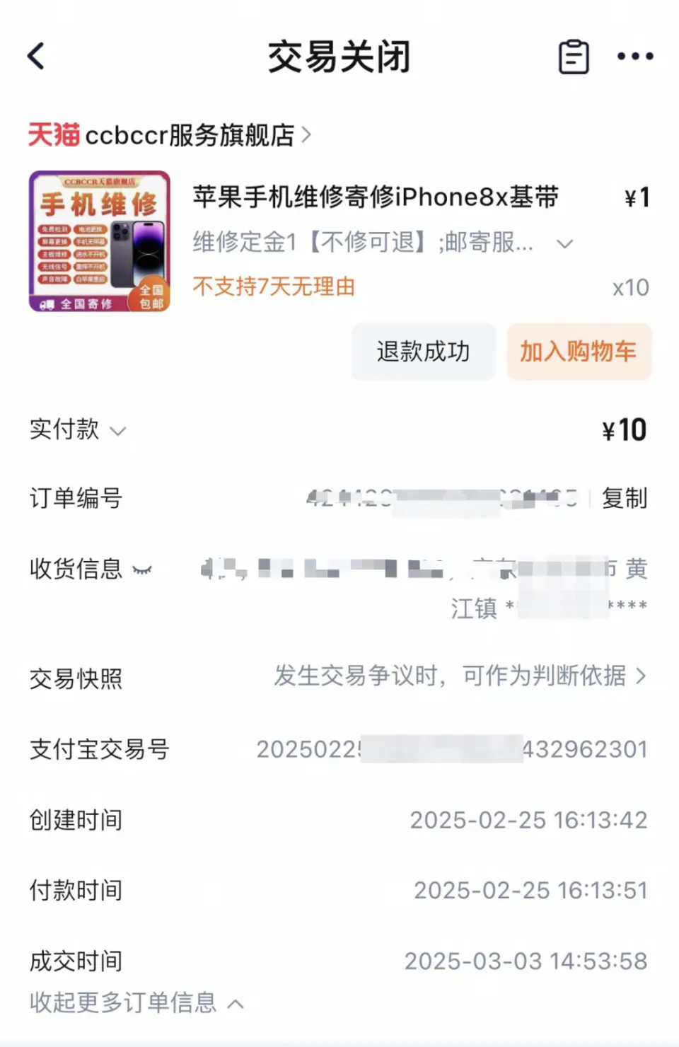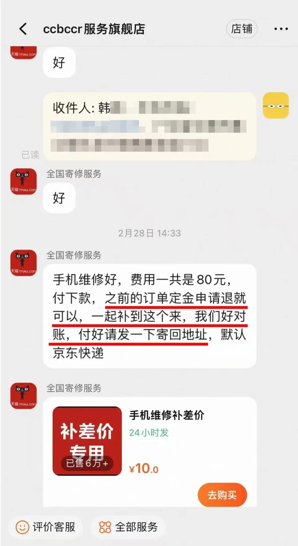 广东的韩先生克日向澎湃公众互动平台“服务湃”(https://tousu.thepaper.cn)反映称,他在淘宝平台一天猫旗舰店购买手机更换电池服务后疑遭遇“消耗陷阱”。商家通过好评店肆引流后,又引导消耗者取消原订单,在另一个店肆链接下单,导致手机因劣质电池鼓包粉碎,维权难。 对此,天猫平台的相关工作职员回应称,目前已经到场相识情况,并帮忙卖家和买家双方沟通处理。 消耗者在天猫一旗舰店下单手机更换电池服务 据韩先生先容,由于其手机电池出现故障无法利用,2月25日,他通过淘宝平台的天猫“ccbccr服务旗舰店”下单了手机电池更换服务,并付出了10元定金,“当时我看到这家店是天猫旗舰店,而且销量比较大,没有差评,觉得比较可靠,就选择了这家。” 付出定金后,韩先生按照客服提供的所在将手机邮寄给商家,“2月28日商家收到手机维修后,通过平台给我发信息,说费用一共是80元,要求我把之前的订单申请退款,然后发给我一个新的‘手机维修补差价’链接,让我通过他发的链接补80元,说方便他们对账。” 韩先生称,当时手机已经维修睦但没有返还,自己只能按照对方的要求在另一个链接里付出费用。付出后,他看到该付款商品链接已经不是“ccbccr服务旗舰店”,而是一家名为“手机维修服务谋划店”的店肆,仅有100余名粉丝,而且新下单为“补差价商品”,后续无法举行评价。 但商家曾答应:“维修的项目质保90天,有问题支持翻修。”韩先生按照对方的要求付出了相关款项,并收到了维修后的手机。 商家引导消耗者取消原订单,并通过另一店肆的“补差价”链接付出费用。 然而4月11日,韩先生发现维修后的手机出现电池鼓包情况,导致手机屏幕翘起,内部元件粉碎,无法再继续利用。韩先生依据3个月质保服务接洽涉事店肆ccbccr服务旗舰店客服后,客服仅同意其将手机电池寄回,否认电池鼓包导致手机粉碎。 韩先生向淘宝官方客服投诉后,经多次沟通,淘宝平台提出可以为韩先生退还80元维修费用及补偿80元红包,但韩先生以为这些补偿不敷以增补劣质电池导致的手机永世性粉碎,拒绝了该办理方案。 “4月24 日,淘宝给我发短信,说无法满足诉求 ,就按照协商和解不乐成办结投诉。”这让韩先生无法理解,他表现,商家利用好评店肆接单,引导消耗者邮寄手机后再退掉原订单,规避平台羁系,显着存在违规举动,但淘宝平台却纵容商家该举动,致使劣质产物泛滥、消耗者权益难保障。 消耗者称电池鼓包导致手机屏幕和电子元件粉碎。 澎湃新闻记者看到,涉事店肆ccbccr服务旗舰店仍在正常谋划中,谋划手机、手表、游戏机等各类电子产物的维修,此中手机维修表现已售4000+,匀称好评率98%。 4月29日,澎湃新闻记者接洽了涉事店肆,客服职员表现,让消耗者换链接下单只是付出链接差别,均受到平台羁系,表现不存在“套路”,“都是志愿的,不是强买强卖。”对于是否由于劣质电池导致手机粉碎,客服未正面回应。 同日,淘宝平台相关工作职员回应澎湃新闻称,平台收到消耗者反馈后,第一时间到场相识情况,并帮忙卖家和买家双方沟通处理。“店肆卖家表现订单仍在90天质保期内,消耗者可重新寄回手机检测,如核实后,可更换电池并处理好售后。同时,买家也可先去相识下线下更换电池的费用,约定后续确认金额后再进一步处理,卖家再负担部分电池更换费用。” 对此,韩先生称,在澎湃新闻到场后,已经有淘宝平台的客服职员接洽他寄回手机举行检测维修。 |