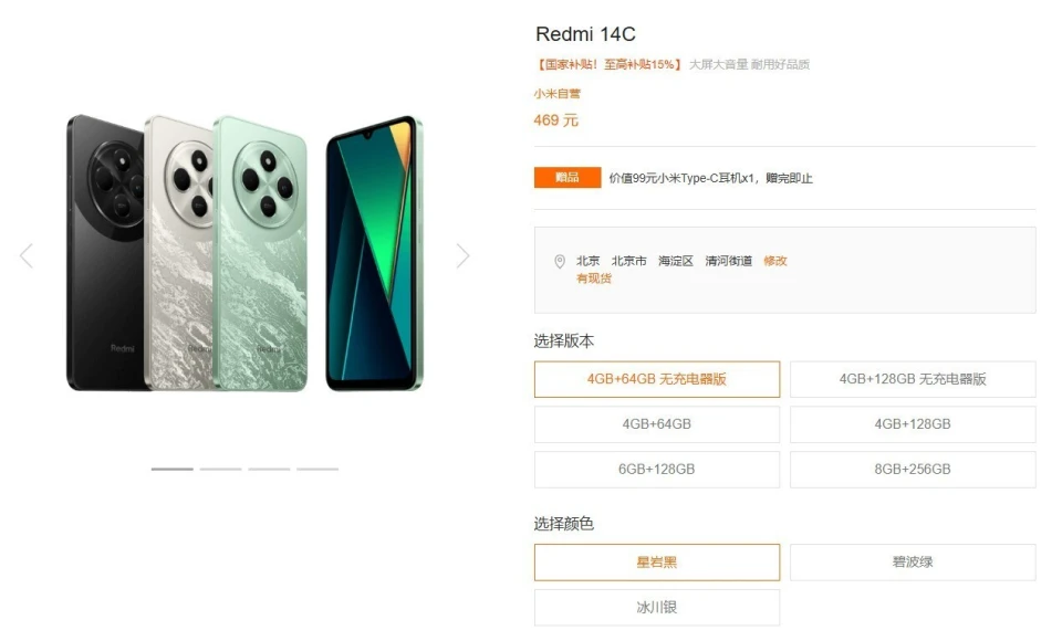 【ZOL中关村在线原创消息】5月15日消息,REDMI 14C无充电器版正式在小米商城上架贩卖。此版本产品不再配备充电器,仅随附充电线。在价格方面,REDMI 14C无充电器版提供两种存储规格选择。此中,4GB+64GB版本售价469