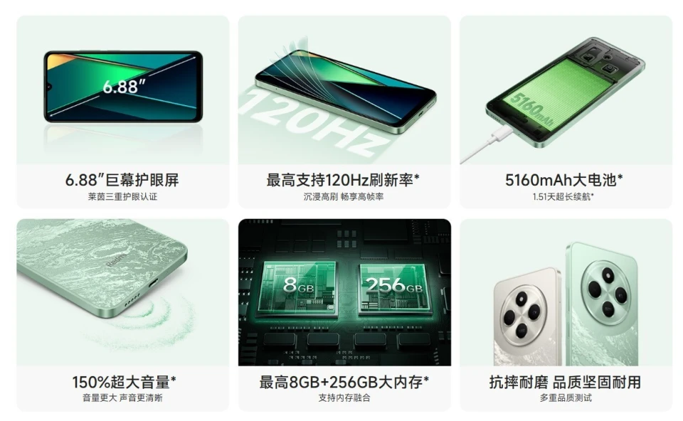 在屏幕设置上,REDMI 14C接纳了一块6.88英寸的LCD屏幕,分辨率为1640*720,并支持高达120Hz的高革新率,为用户带来流畅的视觉体验。