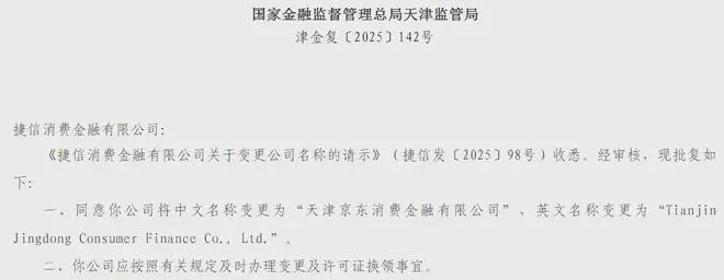 近日,国家金监视管理总局天津监管局已同意捷信斲丧金融有限公司将名称变更为“天津京东斲丧金融有限公司”及“Tianjin Jingdong Consumer Finance Co.,Ltd.”。