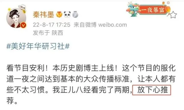 时装秀看得多了。 古装秀见过么? 借个“古”字拼元素,东搞西搞? 不。 上图你们自己品。 华丽、大气、震撼、享受…… 溢出屏幕的古典美,说能上春晚都不为过。 文化类节目卷,Sir知道。 但卷到这个田地的,也就是《唐宫夜宴》和《洛神水赋》。 再往前数,全民点赞的《青绿腰》。 不外,它可没越卷越“窄”。 这些围绕汗青宝藏女性的主题大秀。 反而,火了。 数据为证。 双网收视破1,四网份额破3。综艺播放指数全网第一。 △ 微博@Vlinkage 汉服同袍DNA齐动。 汗青博主亲验后,放心保举,高看一眼。 △ 百万粉汗青大V 小众自嗨? 路人也自觉充当水军。 如果你还没故意识到在发生什么,官媒了局了。 光嫡报:“开发了文化类综艺的新赛道,引领起了中国古典美学时尚新风潮。” 新华网,“拆解国风精华,彰显文化态度。” 中国文化报,“贯古通今艺术文化之美的大秀舞台”“视觉和精力上双重愉悦的沉醉式体验”。 那。 到底是什么样的综艺,雅俗共赏,大众同乐? 又是什么样的拆解,贯古通今。 于传统之盛情会当代之思。 迸发喜闻乐见鲜活强大的文化命力。 如果你和Sir一样好奇。 跟我来,一起走进。 优美光阴研习社 01 秀·美 看官媒考语也看出来了,这节目,先赢在一个“新”字上。 有多新颖? 来看赛制。 主持人汪涵马可,曾互助了《越策越开心》的老搭档,时隔14年再续前缘。 研习社集结了INT01林墨、谢可寅、马启越、安雨、李凯馨、王怡人、张婉清、上官喜好、聂杰铭、陈镜依、左溢、叶子淳12位年轻社员。 12人分成两组:美美组,好好组。 每组要在节目组给出的2位古代女性中,选择此中一位计划一场大秀,而且到场此中。 以是,整个综艺就是研习社员们从拿到题到完成题的过程。 末了的秀,就是小组作业展示。 不得不说,节目组选的女性都很有代表性。先说Sir印象最深的这一场。 赵飞燕。 Sir要按头安利:其他可以不看,这个不看吃大亏,包管你看完直呼牛*。 赵飞燕何人?腰细,好舞,尤其掌上舞令汉成帝爱不释手,引领了汉朝审美。 以是,美美组的社员们以赵飞燕为中央,来了一场汉服形制大秀!!! Sir看完的感觉:满汉全席。种类齐备制作精致,食用完毕身心大悦。 先看名局面:布衣,贵族,宫廷命妇,末了是母仪天下的赵飞燕(飞行高朋张雪迎 饰),鱼贯而出。 126人的大秀! △ 这才是人海战术的准确用法 看完这场秀,根本上就把汉服搞清楚了。 什么人什么时间穿什么衣,用什么斑纹,有何礼制讲求、寓意。 知道有些观众看不懂,美美组还知心地安排相识说。 比如,开始上台的是汉朝最常见的服饰,布衣服饰。交领右衽,甲骨文中的“衣”就反映了这个形态。 贵族女性服饰,最广泛的形制有两种。 Sir只说一种:衣裳制,上衣下裙。上衣用布四幅,象征四序。下裳用布12幅,象征12个月份。 体现了天地崇敬,和“天人合一”的礼制。 风雅讲求的服饰之外,尚有丝织纹样。 信期绣、杯纹、长寿纹、云气绣、龙凤虎纹秀、当卢纹、孔雀纹……一个接一个闪过,虽短停息顿,但个顶个的精致大气,心胸非凡。 痛惜的是,有些能根据马王堆出土文物复原,但有些工艺已经失传。 此中信期纹,寓意等你归来。 古人对万物的认知厘革,就如许化作绵长的祝福传播至今。 如果说,赵飞燕的秀社员们意在展示体态着装,中华服饰科普性。 围绕飞行高朋柳岩饰演的孙寿的秀,社员们更夸大互动性和娱乐性。 史书记录:孙寿,色美而善为妖态。 她的一系列活动一度风靡洛阳,贵妇趋附者众争相模仿。无愧“东汉第一美妆博主”的称谓。 好好组计划了一场古代人的“美妆发布会”,借孙寿的美妆发明,展示了汉的妆容美学。 (女毒粉,记条记) 孙寿发明之一:愁眉,在此根本上,又发明确啼妆。 啼妆,用粉底擦脸,在眼睛下方抹上胭脂,然后搭配“愁眉”即可。是东汉非常盛行的一种妆容。 △ 这不就是女团妆? 一个知识点:张骞出使西域从焉支山带返来的红蓝花,被孙寿用作颜料融入脂粉膏里。 这种膏便有了新名字:胭脂(谐音焉支)。 至于发。东汉盛行假发,发髻繁多。 爱美的孙寿便发明确堕马髻。 此发型不加装饰,只将头发拢起,犹如刚从立即堕下来。 楚楚可怜。 别忘了,尚有形。 孙寿何以被称为“妖态”? 还记得徐克镜头下的青白蛇吗?她们扭着走路的形态,就是罗致了孙寿独创的折腰步。 △ 不得不夸一句徐老怪 别的,尚有张雨绮饰演的虞姬大秀,于文文饰演的花木兰大秀,以及唐朝盛世大秀。 这几场秀,各有看点。 虞姬大秀中的张雨绮,古装扮相惊艳大气; 花木兰替父从军征战战场,不如就来一场磅礴大气的古代兵甲秀; 盛唐歌舞繁华,你也能看到专业舞者带来的极致享受《丽人行》。 末了一场秀。 Sir承认有私心留给她。 一个完全捏造的人物。 纵有学富五车,也只能留下“翩若惊鸿婉若游龙”的写意。无数文人骚客极尽想象,也只有顾恺之倾出全部想象力和感情,仅作一幅《洛神赋图》。 没错,中国的“神女”洛神。 《优美光阴研习社》圆梦了?不会吧? 是的,洛神赋秀来了。 “髣髴兮若轻云之蔽月,飘飖兮若流风之回雪”的仙子,社员们会怎么出现呢? (此处确实没有图) 别急,不但神女,《洛神赋图》中其他神兽如鲸鲵、洛神的护驾白龙、女娲、帝释天等也都悉数还原。 至于效果怎么样,Sir只给你几张图。剩下的自己去看吧。 这些作业大秀,以迥异的风格和载体重现了中国汗青传统之美 