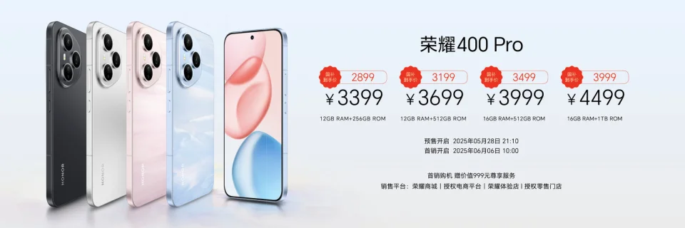 荣耀400系列现腋孚荣耀商城、授权电商平台、荣耀体验店、授权零售门店开启预售,并于6月6日10:00正式开售,共带来海风蓝、流沙粉、揽月银、幻夜黑4款配色,售价方面,荣耀400尺度版12GB+256GB、12GB+512GB和16GB+512GB版本售价分别为2499元、2799元和2999元,国补后售价分别为2124.15元、2379.15元和2549.15元;荣耀400 Pro版12GB+256GB、12GB+512GB、16GB+512GB和16GB+1TB版本售价分别为3399元、3699元、3999元和4499元,国补后售价分别为2899元、3199元、3499元和3999元。