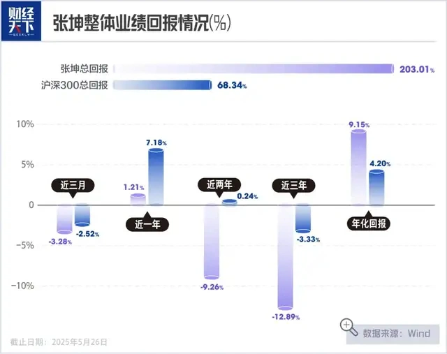 基金贴吧里,不乏对张坤的质疑声,他们的抱怨情有可原——张坤2021年高光时候没少为基民赢利,所持基金总回报率到达203%,但Wind数据表现,停止2025年5月26日为止的最近三年,其回报率已经跌至-12.89%,跑输沪深300基准的-3.33%。