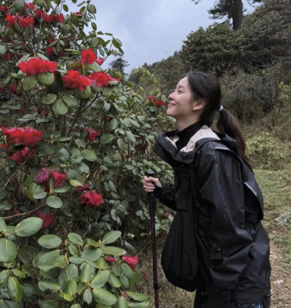 章泽天穿着一件玄色的冲锋衣,简单的牛仔裤,搭配高马尾,整个人的气质都是很好的,还为了看杜鹃花登上了海拔3000米的地方。