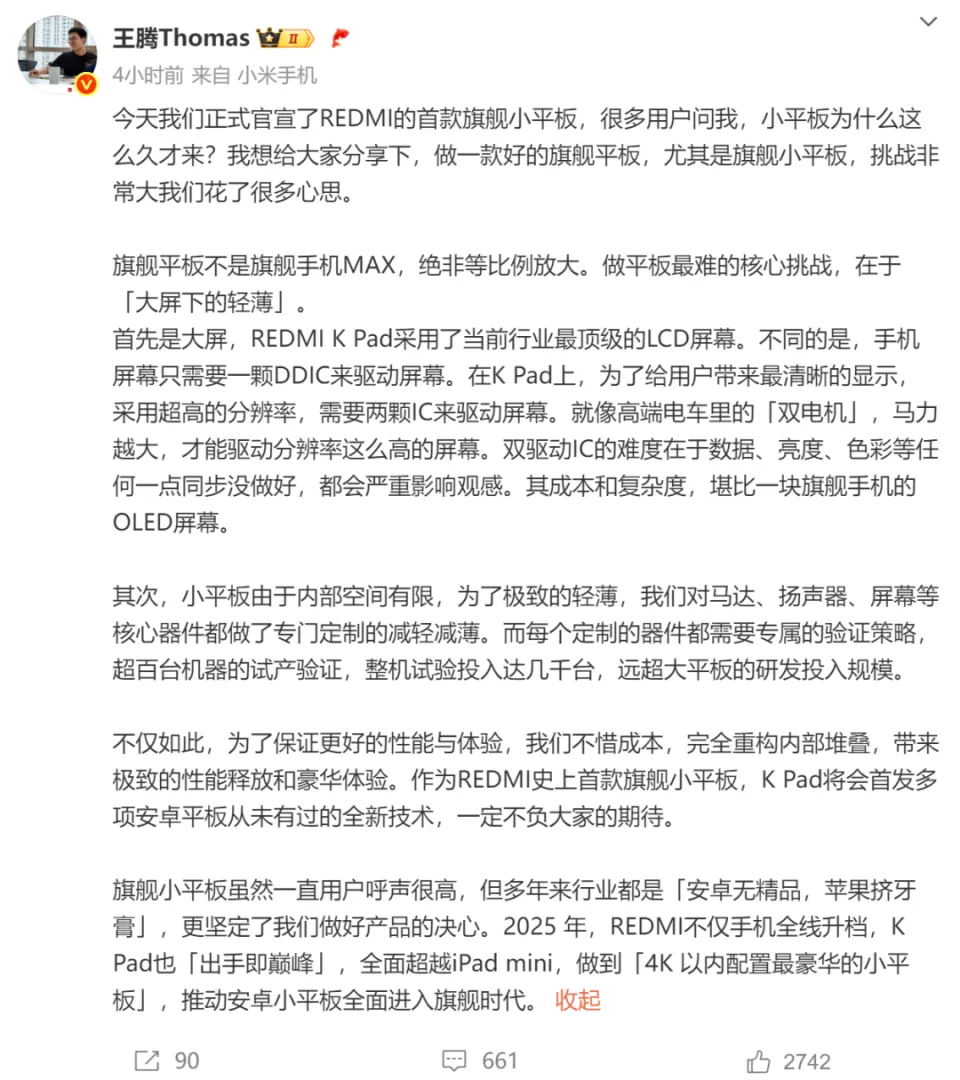 本日REDMI红米手机正式官宣了两款新品coming soon,K80至尊版,定位豪华性能旗舰。别的一款就是REDMI首款旗舰小平板,将会命名为K Pad。 王腾也发长文体现:REDMI K Pad接纳了顶级LCD屏幕,配备了双驱动IC。为了极致浮滑,对马达/扬声器和屏幕都做了专门定制的减轻减薄,而且完全重构内部堆叠。 K Pad将会首发多项安卓平板从未有过的全新技能,全面逾越iPad mini,做到“4K以内配置最豪华的小平板”。 根据现在的爆料信息,K Pad将会接纳8.8英寸3K LCD高分高刷屏,支持165Hz革新率,一体全金属机身。搭载天玑9400+处理处罚器,外围规格接纳了双C口+旁路充电+双0815 X轴马达的组合。 而K80至尊版,则号称3K档最豪华的性能之王。本日王腾已经放出了新机的正面谍照,将会接纳3D超声波指纹辨认,不惧油污湿手。新机将会接纳6.8X英寸1.5K LTPS OLED直面屏,大R角方案。 同样搭载天玑9400+处理处罚器,电池容量7400+mAh,支持百瓦有线快充。外围规格方面,配备金属中框+0916大尺寸X轴马达+同轴对称式双扬声器。 此中扬声器的外放音质体现据悉比小米10S好得多,就看K80至尊版能不能成为新一代音乐手机了~ 高通骁龙峰会将于9月尾举行,那么作为竞争对手,联发科新一代旗舰平台也差不多会在这个时间点左右发布。 克日@数码闲聊站曝光了天玑9500的信息,新SoC将会基于台积电N3P工艺。 CPU继续接纳全大核架构:由1*Travis+3*Alto+4*Gelas构成。此中Travis和Alto是arm新一代X9系超大核,Gelas则是新A7系大核。L3 16MB,SLC 10MB。别的天玑9500还将会支持4x LPDDR5x 10667Mbps+4 Lane UFS4.1。 据悉天玑9500 GeekBench6理论单核跑分将会在3900+,多核跑分会在11000+。作为对比,天玑9400的单核跑分为2900+,多核为9200+。 按照惯例,天玑9500将会由蓝厂X300系列首发,OPPO Find X9系列也会首批搭载,那么各人等待发哥旗舰新SoC的体现吗? |