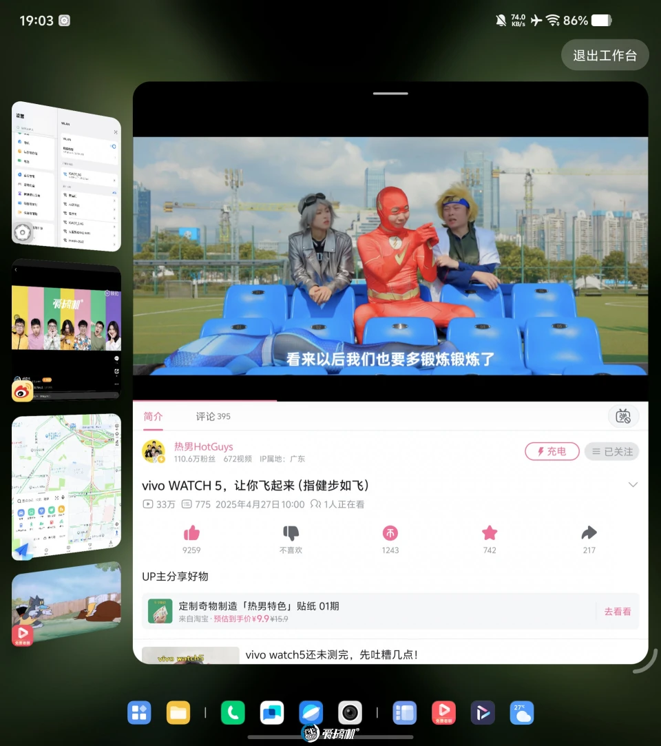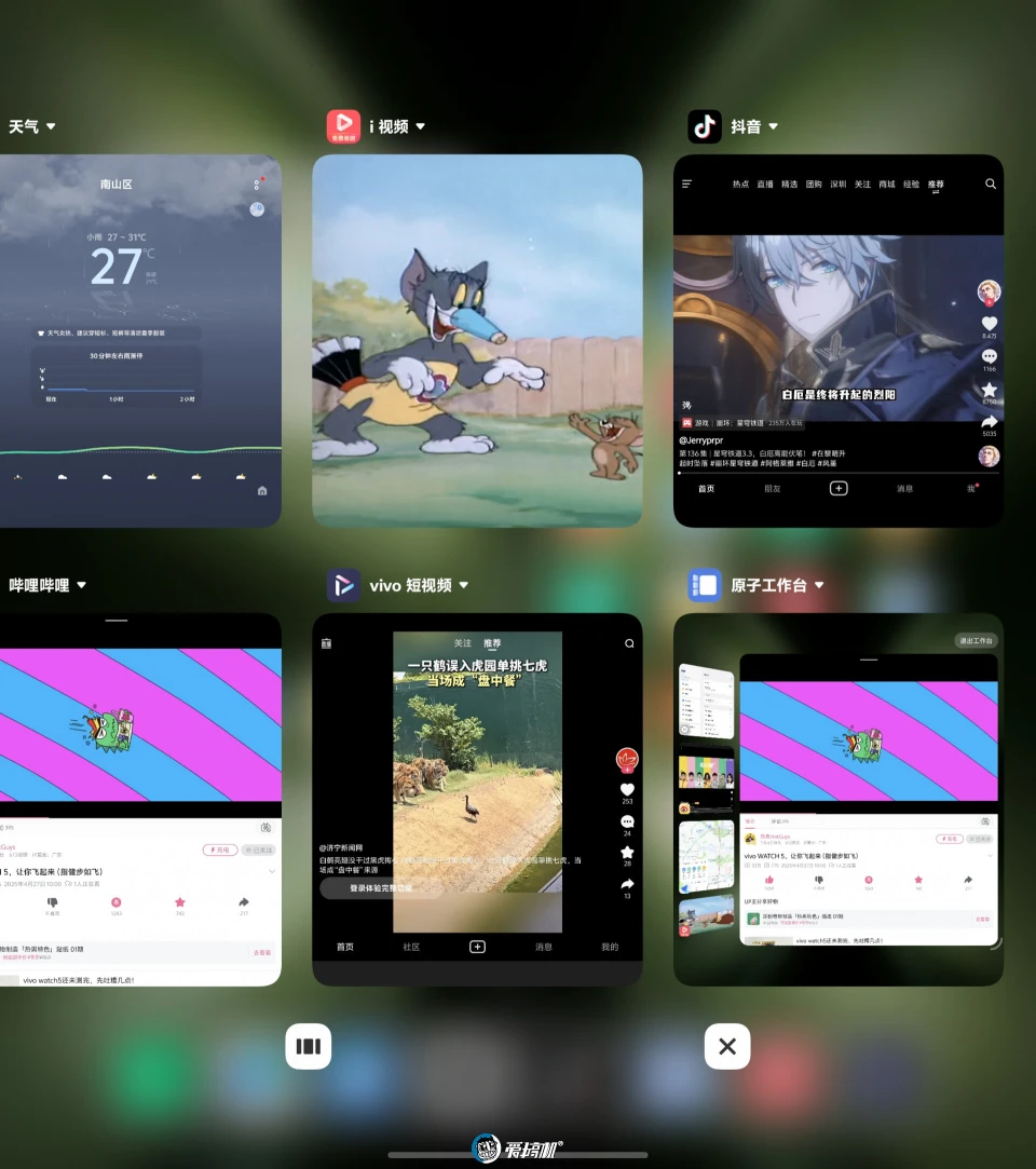 中译中就是vivo的“台前调理”,5个App能同时运行。只要你想,确实可以同时看5个视频↑(甚至5个声音都可以同时播放,surprise!)。