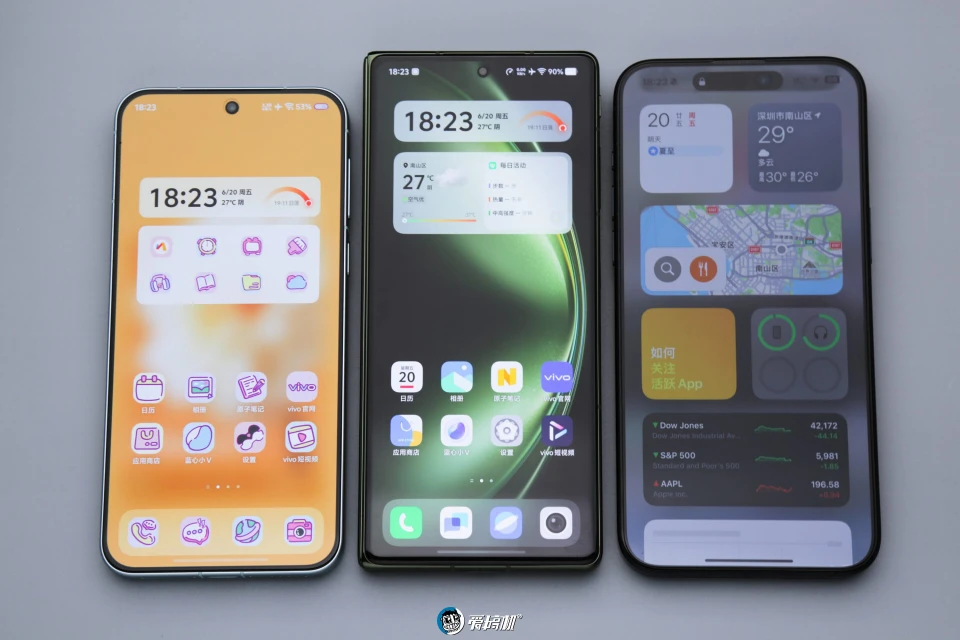 6.31英寸屏幕的vivo S30 Pro mini、vivo X Fold5外屏、6.7英寸屏幕的iPhone 15PM ↑