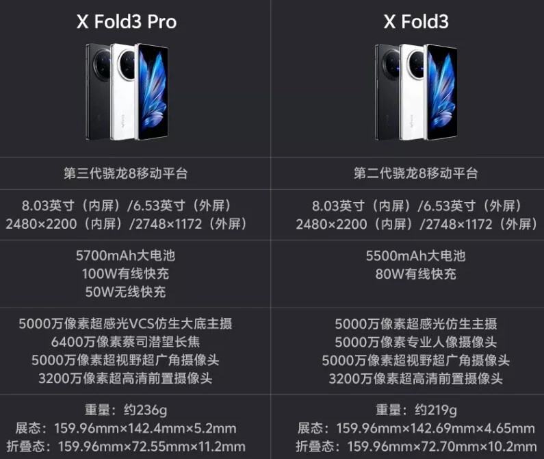 PS:前代vivo X Fold3标准版,是骁龙8 Gen 2,219克重(双超声波指纹的pro版是236克),订价是12+256版6999元,16+256版7499元,16+512版7999元,16+1TB版8999元。