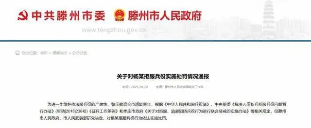 6月20日,山东枣庄滕州市人民政府网站发布《关于对杨某拒服兵役实行处罚情况转达》: