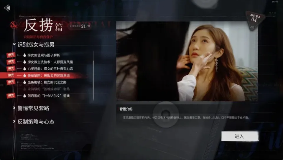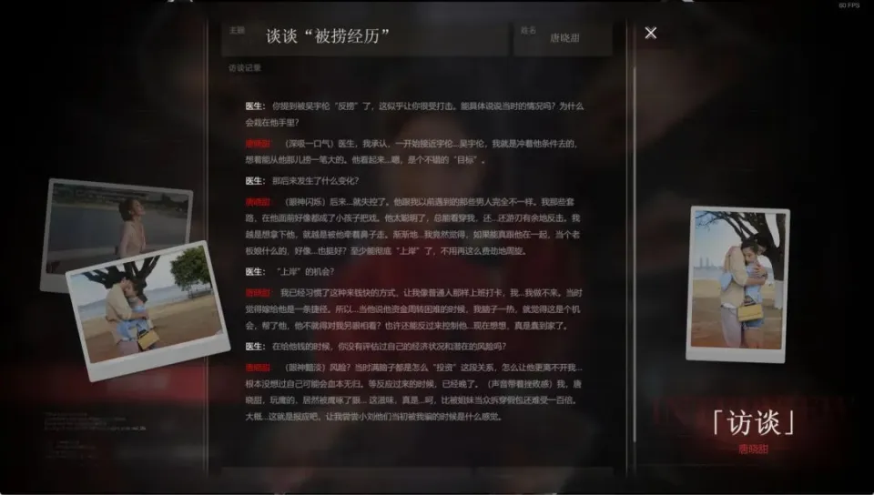 文 / 游戏那点事 Sam 发售第三天,《捞女游戏》成功逾越奥斯汀major期间的《CS2》以及初次开启全平台打折的《黑神话:悟空》,登上了Steam国区热销榜头名。 实话说,早先我对这款红到发紫的作品并不感冒——从显着挑衅互联网敏感议题“雷区”的游戏定名,到以“实际案例改编”和“情绪反诈”为卖点、后续导演个人账号和官方账号被封、游戏改名为《情绪反诈模仿器》的连续串戏剧性事件,都让人感觉像是研发团队火线工作室计划好的「阳谋」: 只要引爆舆论、招致争议,就可以顺理成章地让自己成为一个完美的“殉道者”,在流量狂欢中博取玩家站队恻隐,最终让付费酿成购买“赎罪券”一样平常的举动。这种案例在以往并不稀有。 但在用了约莫10个小时通关剧情之后,《捞女游戏》所展示出的叙事角度和代价立意,却完全出乎了我最初的预料。在我看来,火线工作室可以说用一个宣扬的旗帜,报告了一个克制且抱负化的故事。它的存在看似会随时将炸药桶点燃,然而它传递出来的态度,却是主张消弭对立、信任真爱,无论对男女双方皆是如此。 作为游戏媒体,我自然无意在文章中过多探究社会议题。就游戏自己而言,《捞女游戏》大概在题材方面有一些刻意碰瓷之嫌,但“反诈”和“情绪”这两个焦点,也确实让《捞女游戏》在整条互动影游赛道当中,成为了一个相当特别且「惊艳」的存在。 注意:下文部分内容含剧透,请酌情阅读 01 从“被捞”到“反捞” 与客岁大火的“完蛋like”作品不同,《捞女游戏》并没有选择描画第一人称视角的“恋爱体验”。而是报告了一位初入大城市打拼的青年「吴宇伦」,在遭遇情绪诈骗、人财两空后,决心成立“反捞小组”向克制受害者财帛的“捞女”们睁开复仇的故事。 开篇救下同样因上当而预备自寻短见的员工小刘后,吴宇伦向他提及了自己过往“被捞”的履历,以回想视角开始叙述整段故事的「前因」:十年前,刚刚从大学结业的吴宇伦为了生存而四处奔忙,白天担当服装公司的采购助理、晚上继续跑外卖赚取外快。某天晚上吴宇伦被保安拦在门外,眼看订单即将超时,一位年轻美丽的女子帮他解了围,也成为了两人之间的初次邂逅。 之后,吴宇伦得知了女子名为陈欣欣,是一名刚入行不久的新人主播。在她的约请下,吴宇伦开始风俗于天天定时蹲候在直播间,也渐渐意识到自己对陈欣欣产生了感情。早先是小额的打赏,再到赠予新款手机、刷到直播间榜一……在颠末经心包装的言语引导下,吴宇伦很快便为了这份「爱」而越陷越深,不吝将白天辛劳赚下的积贮挥洒一空。 作为带出后续内容的引子,序章中吴宇伦“被捞”是无法变更的既定毕竟。因此在玩家选择剧情分支时,实际上多多少少会感觉有些出戏——当吴宇伦不断遭遇各种“套路”,或直接被索要财帛时,如果让他半路抽身,便会直打仗发“实时止损”的了局停止游戏。反之要进入下一章,就只能不断走最冲动的门路,直到连爷爷留下的50万遗产都全部爆出去才行。 不外在回归到原来的时间线之后,这些分支选项的目的又会很快变得截然不同。颠末重新振作,吴宇伦现在已经成为了一个新锐服装品牌的首创人。当身份地位今是昨非,决心使用自身资源向诈骗者复仇的吴宇伦,也从当初被引诱中计的“猎物”,酿成了主动出击的“猎手”。 而《捞女游戏》的焦点爽点,很洪流平上也正泉源于此。面临“反捞小组”锁定的各个目的,玩家不但必要让吴宇伦公道地展示魅力吸引对方,还要根据不同脚色的配景履历、举动性格、偏好风俗等信息选择公道选项,才气资助吴宇伦在话术攻防中占据上风完成“反捞”。 以第二章曾经骗取小刘财帛的网红“唐晓甜”为例,如果吴宇伦过早表暴露密切意愿,便会让她产生提防心态,对吴宇伦计划好的剧情产生怀疑;反之,只要选择一些看似“直男”的选项,让吴宇伦始终保持高冷、笃志的人设,唐晓甜会更加敏捷地对他产生感情,最终完成从唐晓甜处取回款项还给受害者们的抨击目的。 而在第四章剧情中,当吴宇伦面临两性博主宋诗琪带头的网暴与质疑,则需一路保持坦诚面临的态度,才气渐渐赢得宋诗琪的信托,为后续引导她落入骗局埋下伏笔。 不难发现,只管《捞女游戏》的剧情是以复仇为主题,但整个过程却并非一边倒的好人对暴徒,反而吴宇伦自身也酿成了亦正亦邪的“渣男”形象。随着章节推进,除了剧情中出现的诈骗套路之外,一些机构贩卖女性焦急的话术,以及吴宇伦引起目的注意的本领,都会被整合进游戏资料档案的“反捞篇”内里,提示玩家怎样辨认捞女与捞男。 换言之,固然游戏定名带有肯定的指向性,但实际上,游戏真正着墨驳倒的显然不范围于“捞女”,还包罗了在此之上的拜金主义,以及“捞”这一举动自己。由此看来,《情绪反诈模仿器》这个新定名,大概确实要更加靠近这款游戏真正的「本质」也说不定。 02 一个个“人物”浮现 除了剧情走向有些“出人意料”之外,在人设塑造上,《捞女游戏》实际上也同样展示出了高于预期的编剧程度,并没有一边倒地塑造出几个脸谱化反派举行驳倒,让玩家体验“以牙还牙”的公式化爽文走向。相反,制作组对绝大部分紧张脚色的塑造都相当完备丰满,使得每一章末端抨击成功后都很难有“大仇得报”的感情开释,反而让人看着有些五味杂陈。 简朴来说,玩家在剧