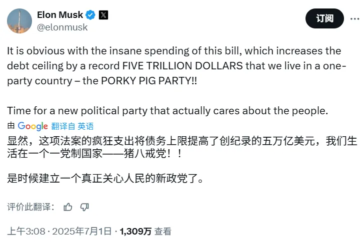 马斯克还在外交媒体X发文指出,这项法案的疯狂付出将债务上限进步了创记录的五万亿美元,是时间建立一个真正关心人民的新政党了。