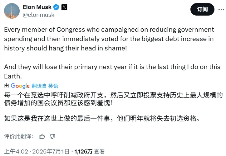 6月30日,马斯克在外交媒体发文称:"每一位在竞选时答应镌汰当局付出、然后立即投票支持汗青上最大债务增长的国聚会会议员都应该感到羞辱!如果这是我在地球上做的末了一件事,他们来岁也会在初选中败北。"