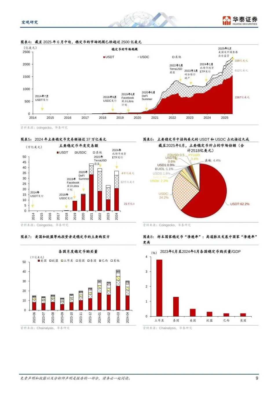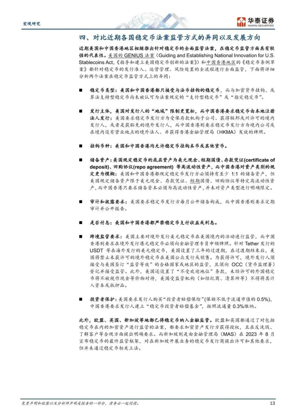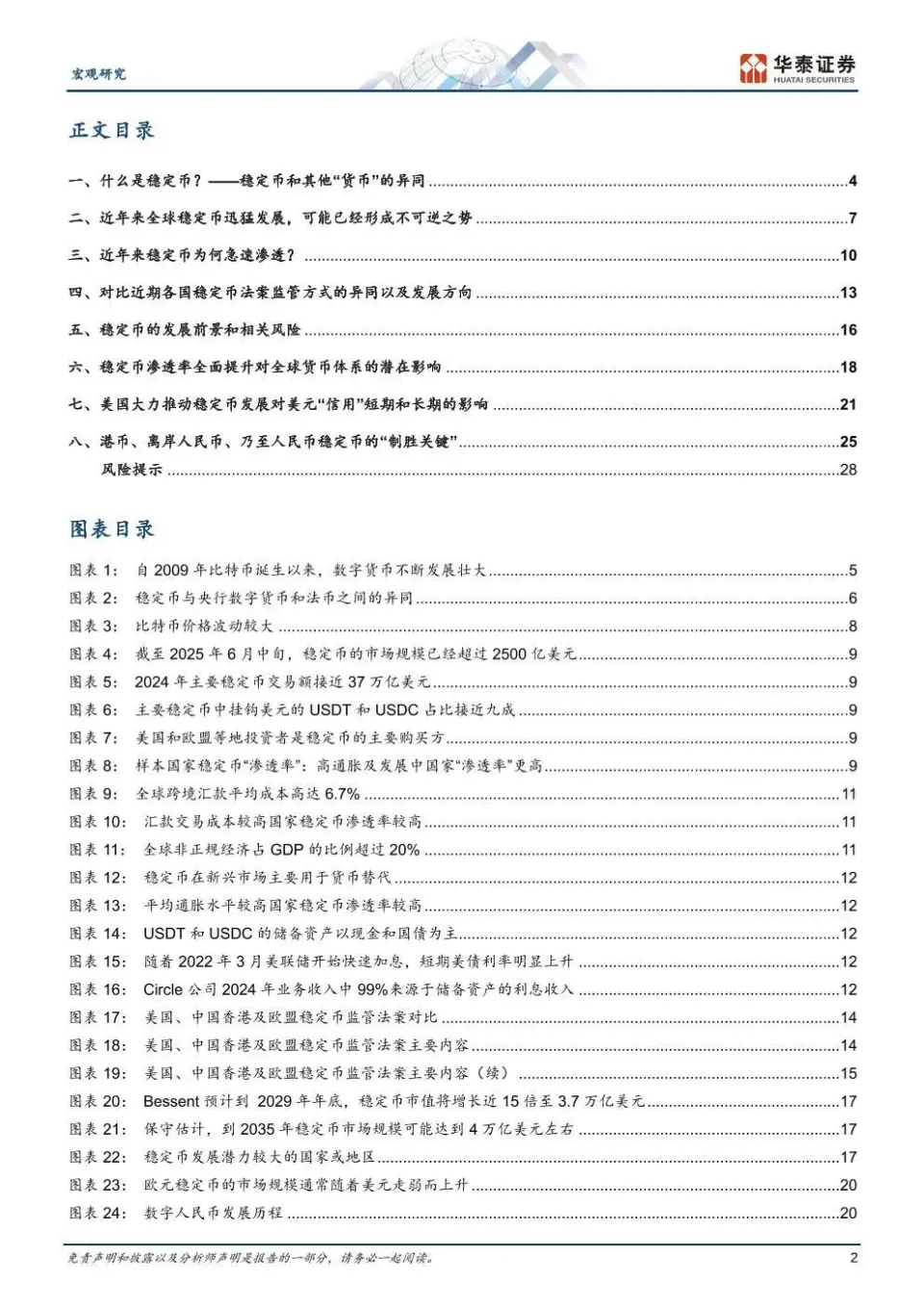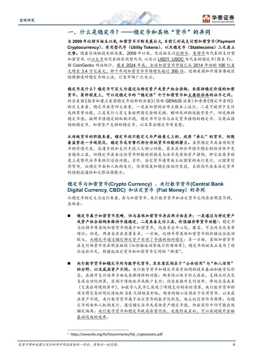#01# 报告择要 1.稳固币概述 稳固币通过与特定资产或资产组合挂钩来保持稳固代价,介于加密钱币和重要经济体的法币之间。 稳固币具备传统钱币的代价标准、流畅本事和支付本事三大焦点功能,但光荣程度和稳固性相对更弱,如今尚不具备法定钱币的强制流畅性和无穷法偿本事。 2.稳固币发显现状 比年来,稳固币市场规模从2014年的50亿美元增长到2025年6月中旬的凌驾2500亿美元,年复合增长率凌驾100%,交易额靠近37万亿美元。如今,举世95%以上稳固币为美元稳固币,重要由美国、欧盟、土耳其等地投资者持有。 稳固币交易极为活泼,2024年交易额靠近37万亿美元(其中链下交易约为7万亿美元,约占举世SWIFT结算额的0.4%)。 稳固币在跨境支付中的优势日益凸显,在银行体系不发达地域、跨境支付受限地区、非正规经济、以及币值不稳的新兴经济体都有潜伏的增长空间。 3.稳固币快速排泄的原因 稳固币兼具加密钱币的技能优势与传统法币的稳固性,在为加密资产提供交易钱币的同时,也是连接加密资产与传统金融的桥梁。 稳固币支付服从高、尤其在跨境支付中的优势凸显,通过稳固币举行支付时,流程大幅简化,确认时间通常以分钟乃至秒计,且支持7x24小时不中断运行。 稳固币支付无需绑定银行账号,且可以绕开SWIFT体系,在银行体系不发达地域、跨境支付受限地区、非正规经济、以及币值不稳的经济体急速排泄。 比年来,数字钱币、元宇宙等假造经济、以及实体经济中非正规经济的快速发展,给稳固币创造了更多的利用场景。 比年来稳固币发行商的红利本事跟随利率曲线一起上升,其发行稳固币的动力也进一步加强。 4.各国稳固币羁系法案对比 美国和中国香港地域相继推出针对稳固币的全面羁系法案,在稳固币羁系方面具有较强的代表性。 美国的GENIUS法案和中国香港地域的《稳固币条例草案》都针对稳固币的发行准入、运营管理、风险处置处罚的全流程举行全面羁系。 重要相关风险包罗交易、尤其是跨境交易合规性,及肯定程度的兑付风险。 5.稳固币的发展远景和相关风险 稳固币的发展仍大有可为,基准情形下,10年后的市场规模可能到达4万亿美元乃至更高,隐含年度增长到达32%。 稳固币占举世链下结总额的比例在如今约0.4%的基础上有望提拔至3-4%。 然而,稳固币也面对诸多风险,包罗交易合规性羁系、兑付风险、以及缺乏类似存款保障和终极借款人保障的制度安排等。 6.稳固币对举世钱币体系的潜伏影响 当前稳固币并不是严酷意义上、当局认可的狭义钱币。但如果稳固币的储备资产包罗法币现金之外的金融资产、尤其有光荣派生功能的债券资产,如果没有对冲政策,则发行稳固币会推升金融体系总活动性。 稳固币的快速发展将如何影响举世钱币竞争格局? 短期内,美元稳固币发展可能仍占据先机,推动举世部分地域“美元化”。中恒久看,重要币种的稳固币恒久“胜出”的概率较大,其中有“潜力”的币种包罗欧元、日元、英镑、乃至人民币。 7.港币、离岸人民币、以致人民币稳固币的“制胜关键” 香港稳固币立法的落地有望加速港币、离岸人民币、以致人民币稳固币的发展,其中港币稳固币可能率先推出。 做大港币稳固币势须要做大、做深、做“稳”其储备资产池、尤其是港币现金外的资产。 鼎力大举发展跨境业务、数字经济、假造经济,妥当且连续推动人民币国际化,增长稳固币利用场景,是香港稳固币市场乐成的关键。 #02# 报告节选 |