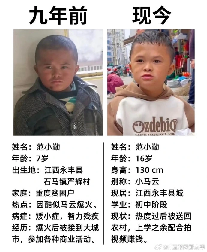 十年前,一张酷似马云的脸让江西男孩范小勤一夜爆红,“小马云”的名号响彻全网。如今,17岁的他早已褪去稚气,但生存却好像仍在原地打转——智力二级残疾的诊断、被围观的一样平常、以及那句直白的“赢利授室子”,让这个曾经的“网红”再次成为核心。