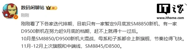 IT之家 7 月 19 日消息,博主 @数码闲聊站 本日曝光各家迭代新机的排期,据称现在只有一家暂定 9 月尾发 SM8850(暂称“第二代骁龙 8 至尊版”)新机,有一家 D9500(天玑 9500)新机在积极赶 9 月尾的档期,赶不上就得十一事后。 别的,该博主还透露,10 月是 SM8850 / D9500 新机大混战,母系和子系都会上新旗舰。11 月-12 月前次旗舰和中端线,SM8845 / D8500。 IT之家注意到,高通此前已公布下一届骁龙峰会将于 9 月 23 日至 9 月 25 日在夏威夷举行。SM8750 为高通骁龙 8 至尊版(8 Elite),预计 SM8850 为骁龙 8 至尊版的下一代。 高通内部列表中,此前对第二代骁龙 8 至尊版芯片(底子型号编号 SM8850),有 2 个版本:一种是台积电制造的 3 纳米版本(编号为 8850-T),另一种是三星基于 2 纳米技能制造的版本(编号为 8850-S)。 而最新消息称高通内部已不再区分版本,只剩下底子的 SM8850 型号,推测指的是台积电制造的 3 纳米芯片。 |