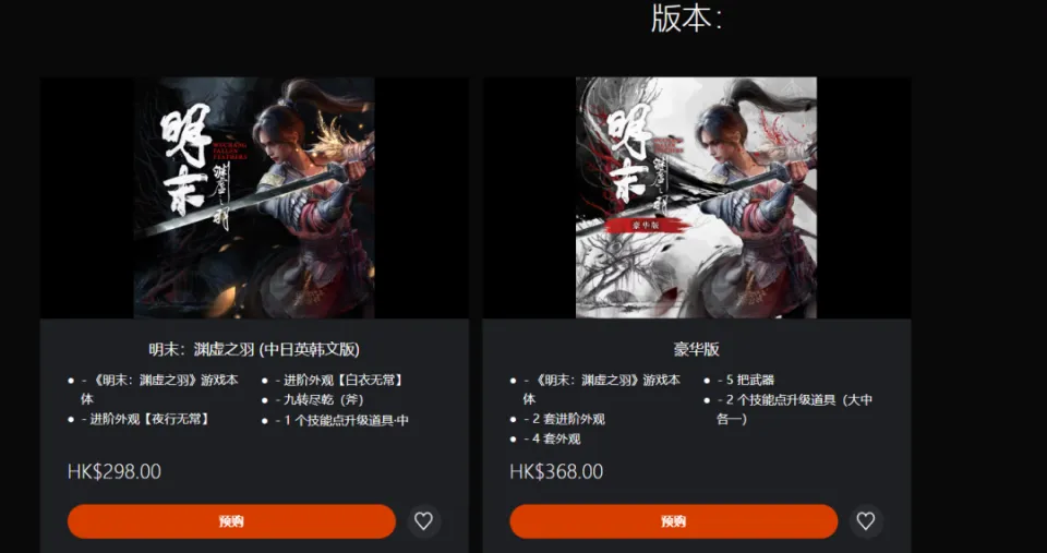 明末港服数字版售价和黑猴划一。标准版售价 298 港币,约 272 元,包含游戏本体,预购奖励有进阶表面【夜行无常】【白衣无常】、斧头【九转尽乾】以及一个技能点升级道具(中)。