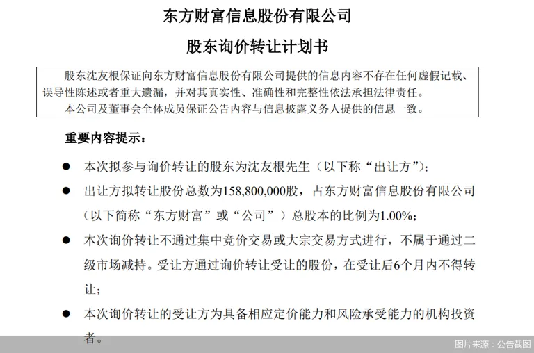 红星资源局7月19日消息,7月18日晚间,A股市场互联网金融平台东方产业(300059.SZ)发布公告称,公司股东沈友根委托中金公司(601995.SH)构造实施东方产业首发前股东询价转让。其拟转让东方产业股份总数约为1.59亿股,占东方产业总股本的比例为1%。 红星资源局注意到,停止7月18日收盘,东方产业股价报23.52元/股,总市值为3717亿元。此次拟询价转让的1%股份,市值达到37亿元。 东方产业体现,本次转让缘故起因为个人资金需求。本次询价转让不通过会合竞价买卖业务或大宗买卖业务方式举行,不属于通过二级市场减持。本次询价转让的受让方为具备相应定价本领和风险蒙受本领的机构投资者。受让方通过询价转让受让的股份,在受让后6个月内不得转让。 公告显示,沈友根并不是东方产业的控股股东、实际控制人、董事、监事及高级管理人员,单独持有公司1.20%股份,持股为IPO首发上市前的股份。沈友根与东方产业控股股东、实际控制人着实系父子关系,为同等举措人。停止2025年7月18日,沈友根、着实及其他同等举措人合计持有股份占公司总股本22.90%。 有媒体报道称,沈友根本次转让股份所获资金,主要用于投资科技创业类企业。此次通过引入优质境内外长期机构投资者,形成一、二级股东有序接力的格局,进而优化上市公司股权布局,助力资源市场实现良性循环。 数据显示,本年一季度,东方产业业务总收入达34.86亿元,同比增幅达41.93%;归母净利润为27.15亿元,同比增幅为38.96%。由于一季度股基买卖业务量增长,其署理交易净收入增长显着。 编辑 肖世清综合中国基金报、公开信息等 |