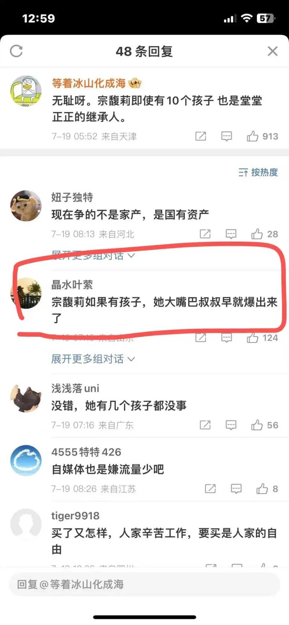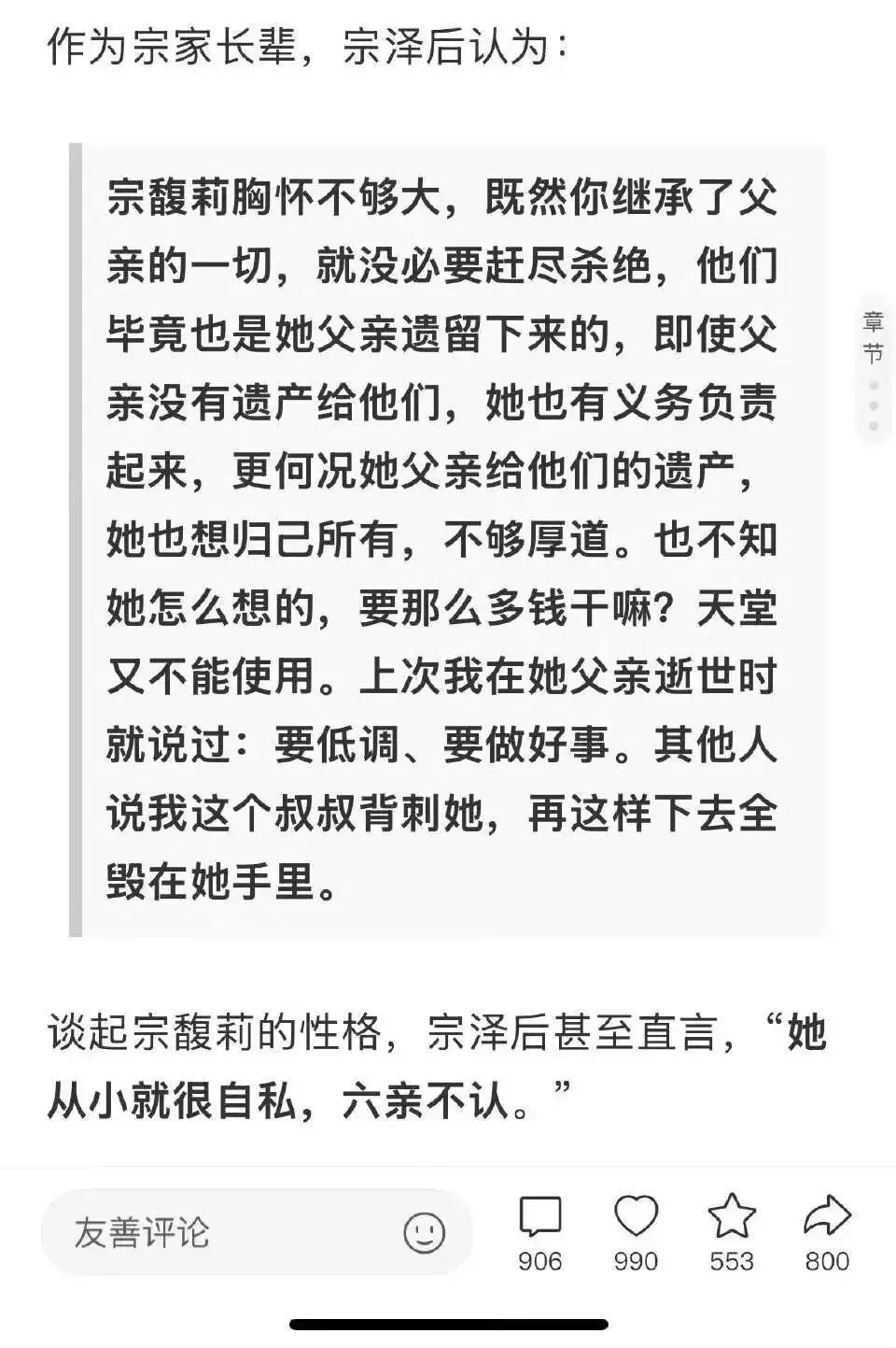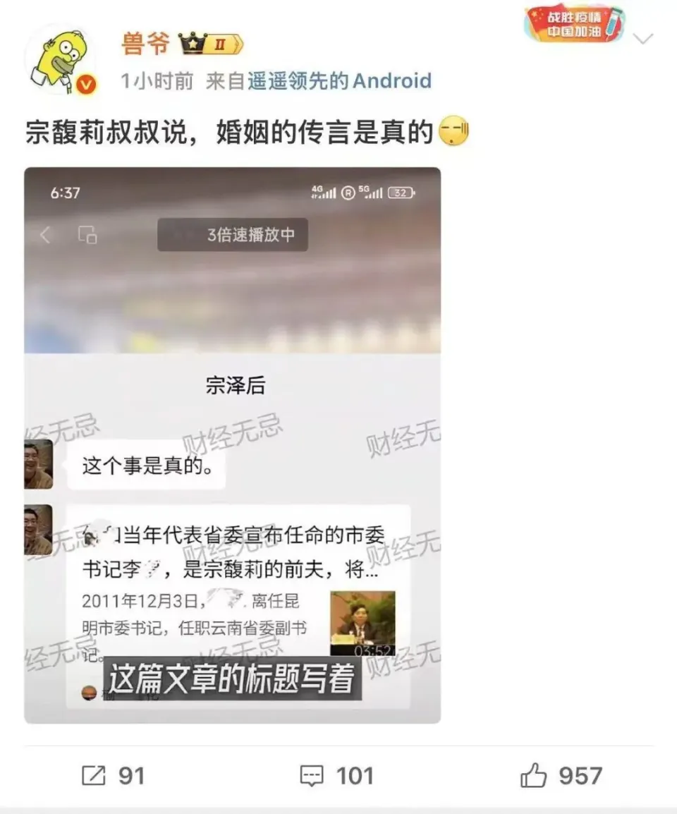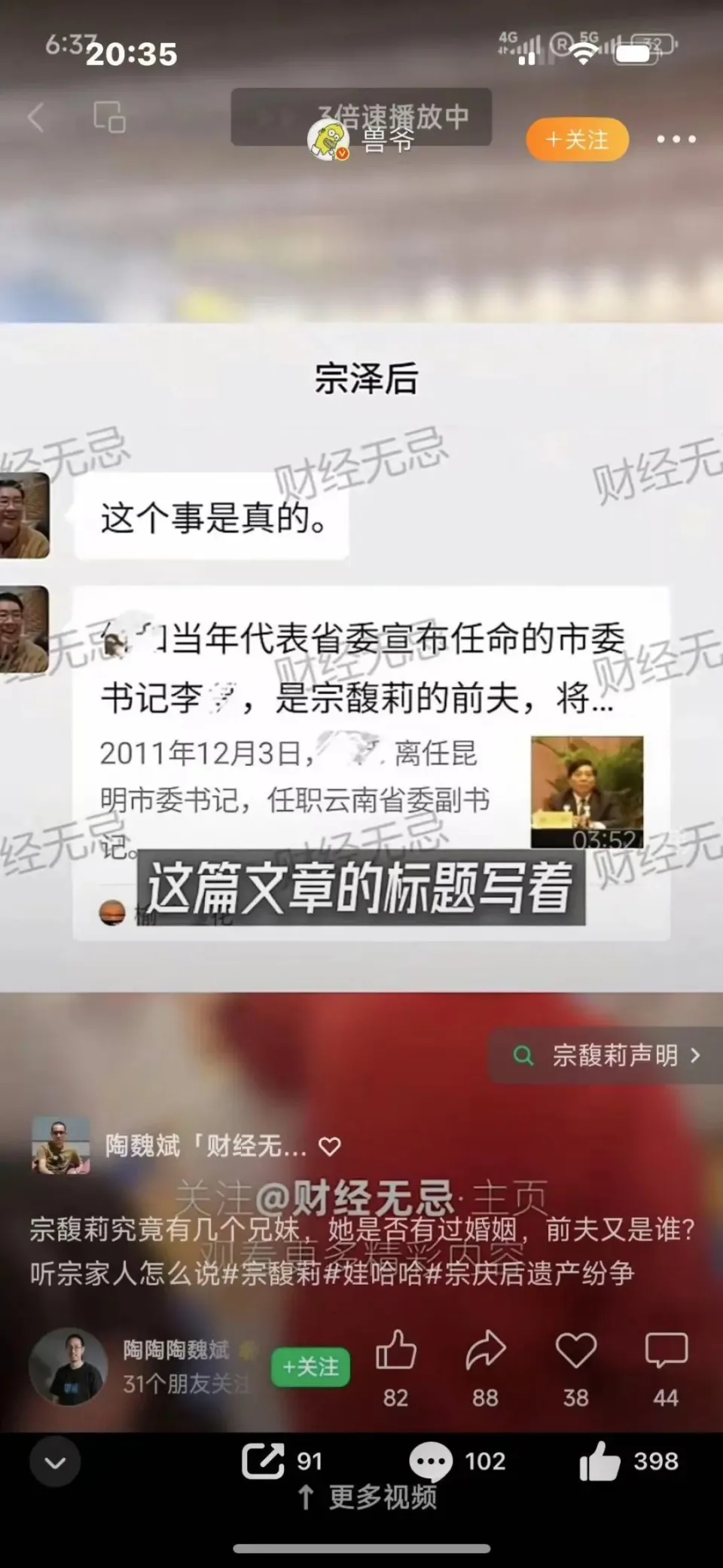 宗馥莉本人此前一直说:我以为我大概这辈子结不了婚了…… ------ 前文回首:宗庆后连生七子?宗馥莉绝食夺权!(更多好文,请在微信搜刮关注“不精确”微信公号) 宗庆后家族剧烈宫斗,又牵涉出长公主的秘密婚姻。 这是个敏感点,由于前夫的身份比较特殊。以是虽然坊间早有传播,但小编一直不敢吃瓜。 宗馥莉本人此前也一直说:我以为我大概这辈子结不了婚了,由于情况比较复杂。 但这一次,是她的叔叔宗泽后对财经无忌的爆料,可信度怎样各人自行判断。已颠末去几天了,并无权势巨子的辟谣声明。 在豪门,生存真的不易,连选择另一半时,须要思量的因素就不是平常人所能想象的。即便云云,智者千虑,仍难免一失。 这是个失败的婚姻。 我们来看看宗泽后是怎么说的。 他是宗馥莉的亲叔叔,不外,在此次宫斗时,一直站在宗馥莉的对立面。 他最著名的一段话是如许说的: 还提过国资流失的标题,这是把宗馥莉往牢里送的仇恨: