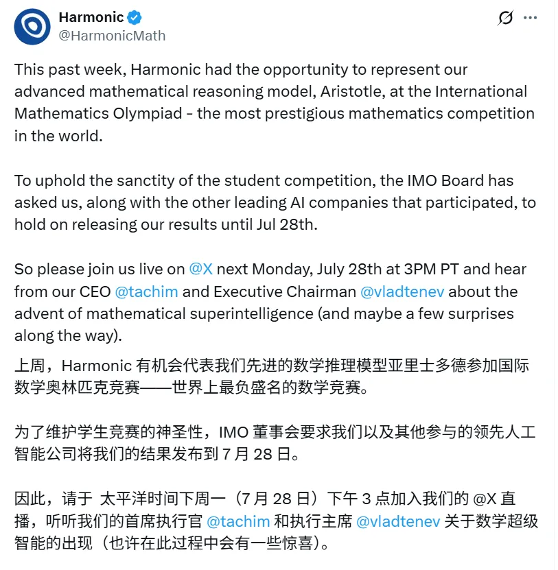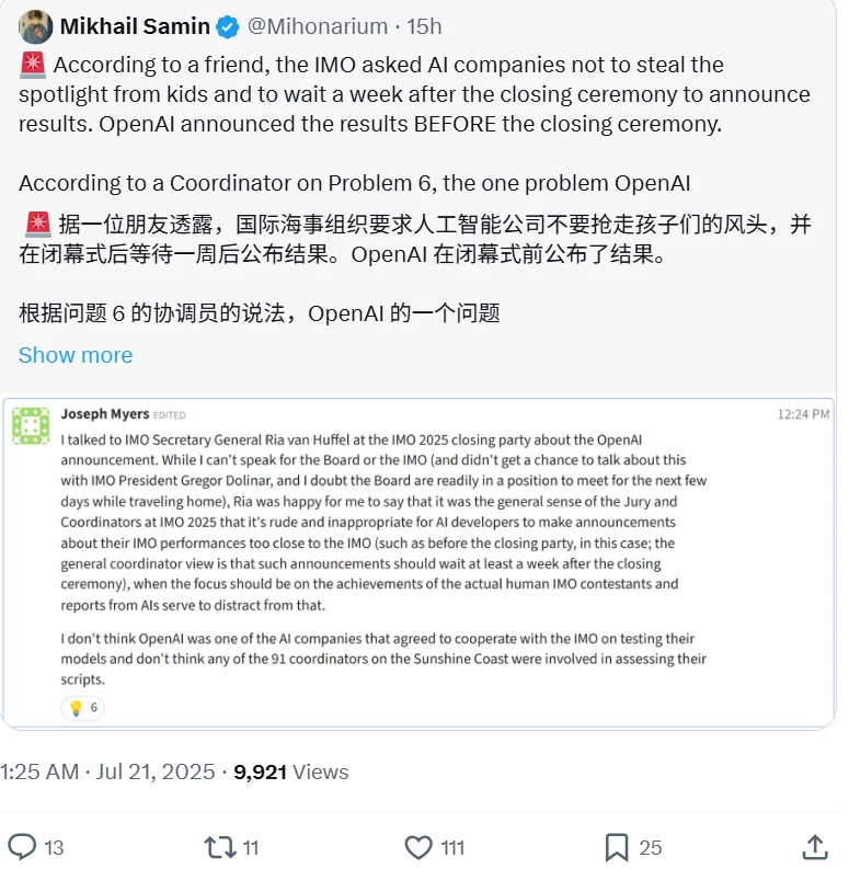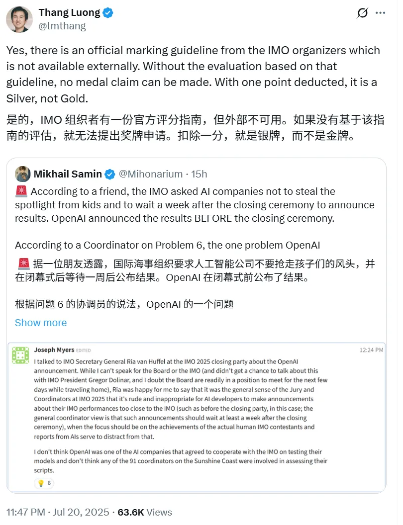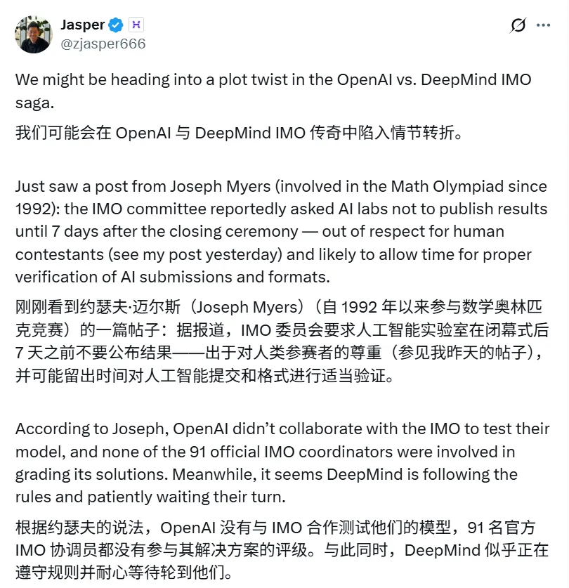 机器之心编辑部 就在上个周末,Sam Altman 大张旗鼓地公布,OpenAI 的一款未公开实行性大语言模子在 2025 年国际数学奥林匹克竞赛(IMO)中达到了金牌水平,得分 35/42,乐成跻身举世顶尖数学竞赛选手行列。 故意思的是,据报道不止 OpenAI,谷歌 DeepMind 在这次比赛中,也拿到了 IMO 金牌。但相比 OpenAI 的高调官宣,这次谷歌显得有点低调。 谷歌的低调是有缘故起因的,根据 IMO 组委会一位成员、两届 IMO 金牌得主 Joseph Myers 的说法,IMO 曾要求 AI 公司(即参赛的大模子)不要抢走参赛门生的风头,发起在闭幕式后一周再公布干系效果,一方面是出于对人类参赛者的尊重,另一方面也是为了留出时间对人工智能提交的答案和格式举行验证。 然而,OpenAI 却在闭幕式之前(但根据 OpenAI 研究科学家 Noam Brown 的说法是之后)就公布告终果。 IMO 评审团和协调员的普遍见解是,OpenAI 的这种做法很无礼,也不合适。 遗憾的是,OpenAI 似乎更在乎炒作和声量,不吝抢占参赛门生的风头,于是他们在昨天就提前公布告终果。 来自 OpenAI 的员工在庆贺自家模子获得了 IMO 金牌,时间和 IMO 闭幕式时间非常相近,闭幕时间在 7 月 19 日(当地时间)下战书 4 点举行。 也不知是否是由于 OpenAI 抢发,机器之心也相识到,谷歌 DeepMind 与字节 Seed 团队 IMO 竞赛的效果,也将在本日大概近期公布,且分数是官方评的。 别的,Joseph Myers 还表示,OpenAI 没有与 IMO 互助测试他们的模子,91 名官方 IMO 协调员都没有对 OpenAI 的解决方案举行评级。 相比来看,DeepMind 似乎很遵守规则,并耐烦等候官宣时间。 一家专注于数学 AI 的初创公司 Harmonic 公开证明了这一点:「为了维护门生竞赛的神圣性,IMO 董事会要求参赛的 AI 公司必要比及 7 月 28 日发布效果。」 看来,OpenAI 确实是没有遵守 IMO 要求,提前就把效果公布了。 谷歌 DeepMind 推理团队负责人 Thang Luong 对此事也举行了点评,表示道,IMO 组委会确实有一份官方评分尺度,但这份评分指南并未对外公开。如果没有依据该评分尺度举行评估,参赛构作育无法宣称获得奖牌。如果有一分被扣,那就是银牌,而不是金牌。 IMO 金牌得主 Jasper 观点与 Thang Luong 的观点相似:IMO 的竞赛标题通常包罗 6 道,每个题目 7 分。金牌的分数线是 35 分,银牌 28 分,铜牌 19 分。纵然是扣除很少的分数,OpenAI 也大概跌落到银牌。Jasper 认为从 OpenAI 提交的内容来看,他们的答案很大概会被扣掉一些分数。 陶哲轩(Terence Tao)也指出,只管标题保持稳固,但测试情势至关紧张。一名在尺度条件下大概无法获得铜牌的门生,若在修改后的赛制下甚至大概摘金。以是说,OpenAI 是否获得金牌,现在照旧一个问号。 如果真像前文所说的,OpenAI 终极获得银牌,这种反转照旧挺残酷的,究竟他们放肆宣传本身的模子是金牌得主水平了。 OpenAI :没有人通知我们一周后才气公布 对于此事,OpenAI 也做出了回应,OpenAI 研究科学家 Noam Brown 表示,他们是在闭幕式之后发布的效果,他个人提前接洽了一位 IMO 构造者,并根据其发起时间发布效果。同时,Noam Brown 表示,没有人告诉他们「一周之后」才气发布。 别的,Noam Brown 还表示 IMO 官方几个月前曾接洽他们,提出在比赛结束后提供 Lean 格式(允许用户将数学定理和证明以机器可验证的情势表达)的标题,但 OpenAI 拒绝了。 这算不算回应了前面的质疑:官方要求参赛 AI 公司闭幕式后一周再公布干系效果,但我们根本没参赛。 这一回应引发了网友的猛烈讨论,对此你怎么看呢? |