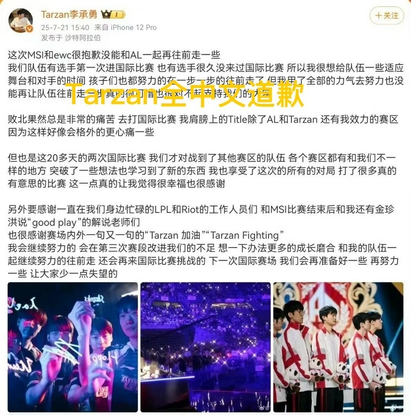 媒介:S15赛季的比赛已经正式开始了,信托绝大多数的玩家都关注了迩来一段时间的对抗。石油杯的比赛竣事之后,lpl赛区的粉丝大多数都释怀了,几年的时间里,顶级选手不停流失,lpl赛区的粉丝也都明确了和lck赛区之间已经产生了一条很难逾越的鸿沟,Al战队在决赛的舞台中已经拼尽全力,终极还是棋差一招。比赛竣事之后,打野选手tarzan的长文致歉也引来了许多粉丝的热议,根本没有任何的黑粉,大家都以为他不必要致歉,信托tarzan,你可以的。 Tarzan长文走心致歉 信托绝大多数的玩家对于al战队还是比力熟悉的,这个赛季al战队经历了一些人员调解,说真话,他们的阵容配比并不是特殊的精彩,乃至粉丝们都以为结果不会很突出,根本上处于lpl赛区一个中游位置,谁能想到从第一赛段开始,这支战队的结果就让全部的玩家感到不测,先是打入了第一赛段的决赛,随后在第二赛段的对抗中更是一连击败了lpl赛区的多支顶级强队,拿到了冠军。对于他们这套阵容来说,上单圣枪哥,打野Tarzan,中单香克斯,AD hope,辅助Kael,可以或许拿到lpl赛区的冠军就已经黑白常顶级了。 Msi的比赛,他们的状态也保持的很不错,和gen战队,T1战队都打满了五局,但终极都是惜败,没可以或许翻过两座大山拿到冠军。同样,石油杯的比赛也是云云。在快速的比赛情况中,他们先是击败了hle战队,随后又碾压了T1战队。但在最后的BO 5对决中,还是被gen战队强压一头,没可以或许打出让二追三的对决。但绝大多数的粉丝对于这一次的比赛已经很满足了,双方战队上演了顶尖对决,al战队也没有让玩家们扫兴,比赛竣过后,大家也都看清了和lck之间的差距。 打野选手tarzan应该是这一次比赛中最顶级的玩家,同时也是al战队核心指挥,输了比赛,他也是发长文致歉,在msi和石油杯,非常歉仄,没可以或许和al再往前走一些,队伍中有选手是第一次进国际比赛,也有选手好久没来过国际比赛,以是想给队伍一些顺应的时间,孩子们也积极一步一步往前走,我也用了全部的积极,惋惜没可以或许让队伍再往前走一步,对不起大家对我们的支持,后面也是预测了一下三赛段的比赛,为天下赛做准备。全中文的致歉确实是有心了。 按原理来说,一出现致歉的环节,Lpl赛区的品评区黑白常杂乱的,就算很走心,也会出现一小部分质疑的声音,但这一次对于tarzan全部的玩家都释然了,网友们出奇的划一都认为tarzan不必要致歉,al战队的选手们已经拼尽全力了。大概这就是战队和战队之间的差距吧。S14赛季的天下总决赛blg战队和T1战队也是鏖战五局,终极没可以或许拿下第五局的胜利,遗憾错失了天下赛的冠军奖杯,但当时对于blg战队的讥讽声音就许多,大概也和战队的代价有肯定关系。 再见认为 没想到tarzan竟然全中文长文致歉,几年的时间里,感觉他已经快要成为一个中文通了,无论是采访还是致歉,都可以或许云云的行云流水。许多lpl赛区的玩家也盼望他可以或许一直在lpl赛区打下去,感觉他是一个大器晚成的宿将,之前在格里芬战队的时候也是绝对的核心,但没有那么的显着。来到lpl赛区之后,得到器重彻底成为了顶级人才。 各位观众老爷们怎么看这个事故呢? |