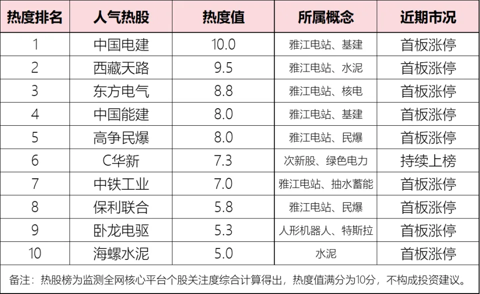 昨日,雅鲁藏布江下游水电工程引爆A股,整个市场70多家上市公司涨停,涉及基建、水利、水泥、爆破、工程机器等诸多板块。 本日A股十大人气热股被雅江水电站概念刷屏,具体如下:中国电建、西藏天路、东方电气、中国能建、高争民爆、C华新、中铁工业、保利团结、卧龙电驱、海螺水泥。除C华新、卧龙电驱外,别的均与雅江水电站相干。 别的,中化岩土、华新水泥、铁建重工、创建工业、三一重工等也热度靠前,也均为雅江水电站概念。 中国电建为环球水电创建龙头企业,只管千亿市值依旧一字涨停,中国能建亦靠近千亿,引发资金关注和板块联动效应,热度可见一斑。 西藏天路作为西藏地域水泥龙头,直继承益于总投资1.2万亿元的雅江水电站水泥需求激增预期。 东方电气港股一度“乌龙指”暴涨700%,最终亦收涨65%,A股一字涨停。 民爆概念股集体活泼,高争民爆为西藏地域民爆行业龙头,叠加一季度净利润同比暴增94.26%的业绩驱动,引发市场对其稀缺牌照和地区把持上风的追捧。保利团结同样涨停,其民爆概念和水利板块的双重属性得到资金青睐。 注册制次新股C华新连续上榜,该股作为绿色电力概念股,在上市后履历剧烈异动引发关注,高换手率及新能源政策利好刺激,形成多空剧烈博弈的短线热门行情。 本文源自:金融界 |