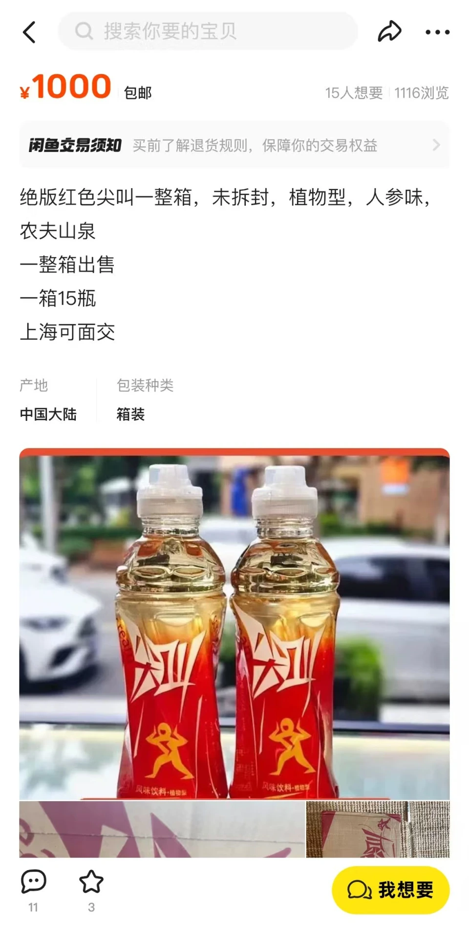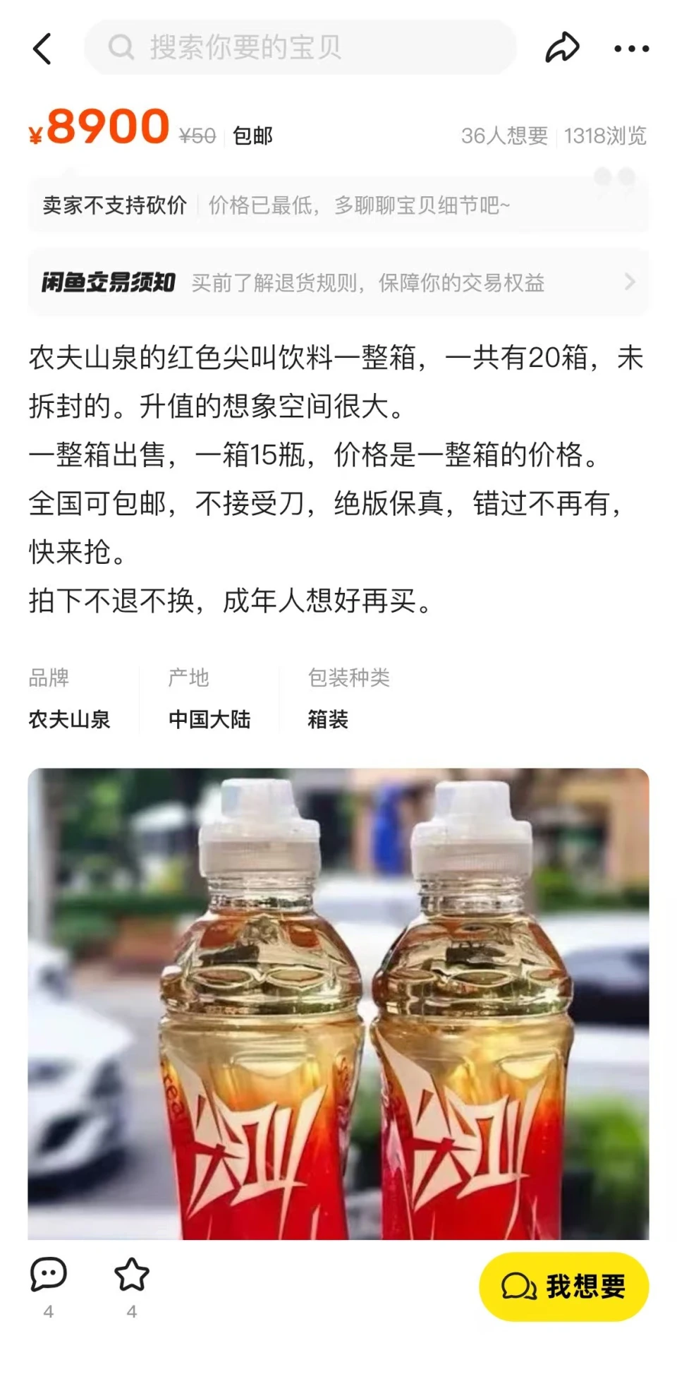 7月22日,观察者网发现,有卖家以致挂出了8900元一箱(15瓶)的离谱代价,并在商品简介中夸大,“升值的想象空间很大。不继承刀,绝版保真,错过不再有,拍下不退不换。” 另一位贩卖整箱赤色“尖叫”的上海卖家则体现,如今手中有两箱完备货品,但仅出售一箱,绝版收藏品不继承还价,如今包邮1000元,上海可面交。