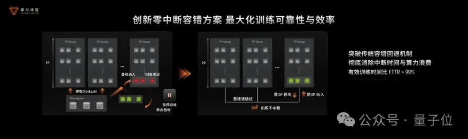 通过夸娥盘算集群,摩尔线程将单点的GPU性能优势,乐成扩展到了千卡、万卡以致更大规模的集群层面,构建起了一个真正具备强大“生产力”的AI超等工厂。而且通过实测,KUAE 2大规模智算集群,在差别架构模子的MFU,已经到达了行业领先程度。 零制止容错技术:超等工厂的“安全生产协议” 对于一个须要7x24小时不间断运行的AI超等工厂来说,稳固性压倒齐备。一次意外的宕机,大概意味着数百万美元的丧失和数周工作的付诸东流。因此,摩尔线程开发了独有的“零制止容错技术”,这是保障工厂稳固运行的“安全生产协议”。 传统的容错机制,在硬件(如GPU卡)发生故障时,须要停息整个训练任务,人工替换硬件,再从近来的Checkpoint恢复,整个过程耗时耗力。而摩尔线程的零制止技术则完全差别: