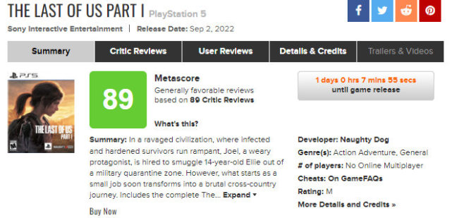 《末了生还者 第一部》环球媒体评分现已解禁,本作现在在Metacritic网站均分89,来自89家媒体。本作将在9月2日正式发售,为PS3《末了生还者》初代的重制版,P本次S5版参加了“永世殒命”“速通”“无停滞”等模式以及艾莉和乔尔新外貌,基于PS5主机性能加持下画面将得到提拔,AI智商也会有相应的进步。 |