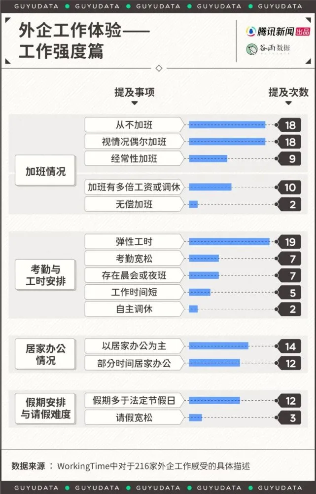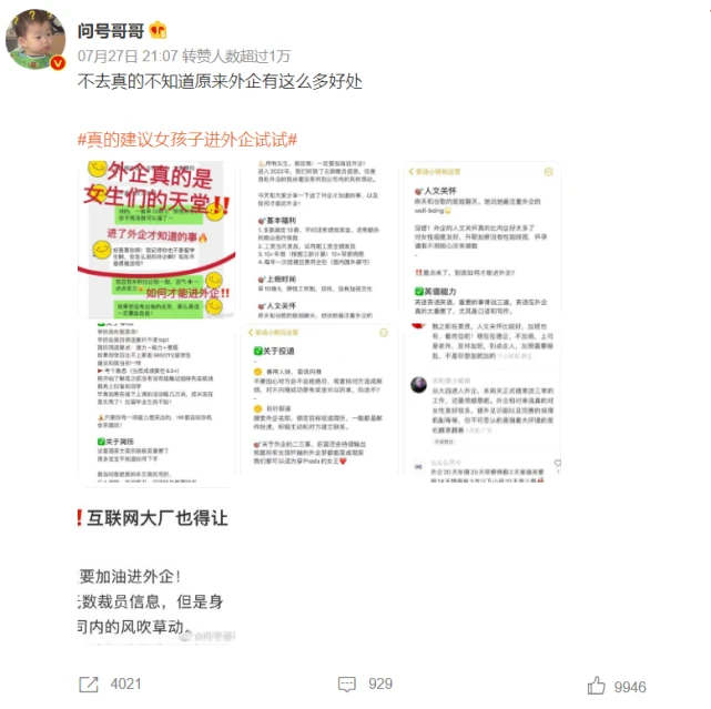 在谁大家人评论举世化的年代里,外企曾是职场金字塔的顶端。它代表高端,代表精英,打工人空想在外企写字楼里,用中英混合的黑话和同事们品鉴一杯手磨咖啡——这意味着阶层的跃升。 但这好像是很长远的事了。厥后,国内互联网公司崛起,人们向往996的高薪;再然后,互联网光芒暗淡,人们发现公务员和国企才是宇宙止境。 年轻人的就业选择折射出这个天下到底发生了怎样的变革。如今的变革是,外企卷土重来,重新成为打工人空想的行止。考公考编固然稳,但你考不上;至于民企呢,本日还在996,来日诰日去上班,大概就发现公司没了。 于是,人们想到谁人曾被嫌弃钱少、不求上进,尚有玻璃天花板的外企。 外企成为最引人跳槽的“神仙工作”起首,你能感受到外企不停攀升的存在感。 7月尾,微博上的热门话题是,“真的发起女孩子进外企试试”。相似的尚有知乎,“在外企工作爽吗?”吸引了2600多个回复,4千多万欣赏量。就连看起来好像与求职八竿子打不着的小红书上,也容易可以刷到如许的内容:“最值得去的小而美公司保举” “955不加班神仙外企合集”。“双休”“不加班”“女性友爱”“拒绝996!” “WLB(work life balance)”,这些都是当下求职履历分享贴里的高频词。 如今外企真的成为年轻人的首选了吗?这个说法也不全对。 对于应届毕业生来说,着实国企仍旧照旧求职时最受接待的“初恋对象”,而外企则是职场老油条们最想跳槽去的“梦中情企”。 前程无忧发布的《2022届毕业生工作意愿观察》表现,应届生最想去的公司范例依次是国有企业(79.5%)、政府机构(49.9%)、 跨国公司(35.8%)。 智联雇用发布的《2022大门生就业力调研陈诉》表现,2022届毕业生渴望就业的单位性子依次是国有、民营、奇迹单位、三资企业(即中外合资策划企业、中外相助策划企业、外商独资策划企业)。BOSS直聘等平台的数据也根本同等。 但对于已经在职场摸爬滚打多年的职场人,在第一财经发起的“2021年公司人薪酬福利大观察”中,他们最想跳槽去的公司是外资及合资企业,国企排第二。 最真实的外企入职体验那么,如今的外企究竟是什么样子?为什么能吸引人投简历呢?观察陈诉里的数字不敷具体,企业雇用广告里的描绘不知真假,相比二者,外企员工们对东家的点评和吐槽才是最真实的一手质料。 在一个叫做WorkingTime公司作息表的协作项目里,差别行业的职场人填写了本身具体的作息时间以及对公司的评价。停止8月1日,共搜集了6874条数据,此中1300多人明白标注了地点企业的企业性子。 最少从上放工时间上来看,如今幸福度较高的,当属外企。具体来说,国企最常见的是“朝八晚五”,外企是“朝九晚六”,但外企10点之后上班的显着比国企和民企更多,20点之后放工的也显着更少。对于久经狼性文化拷打的打工人来说,晚上6点能放工,就是这辈子最大的福报。 但要知道职场人们为什么选择外企,他们最在意什么,照旧得看他们的谈天高频词。在WorkingTime里,尚有216位外企员工形貌了本身的公司和工作感受。我们对这些具体形貌举行归纳总结,一共梳理出十大话题。此中外企的竞争氛围、加班环境、考勤与工时安排三大话题是外企人最在意的。 在报酬发展方面,70.6%关于薪资报酬的评价、71.4%关于职业发展空间的评价都是负面的。大多数外企人并不以为本身的报酬在偕行业里属于高水平。“升职难”“技能陈旧”等诉苦也比力突出——这与十年前人们对外企的诉苦如出一辙,那是外企走下神坛,互联网高歌猛进的期间。 不外,在一样寻常福利方面,94.1%的内容都是正面的。免费零食、免费午餐、免费健身,以及高大上的办公条件,险些堪称外企必备。 下面来到职场老油条们最器重的“工作强度”环节。传说在外企,加班是少少数,弹性工时制度较为广泛,可长期居家办公——数据证实,传说都是真的。 有的外企不光不鼓励加班,以致只管克制本地员工加班,还派出向导巡查。有的法定节沐日给三倍工资,这是卷王们的狂欢节,“大部门会为了加班费只管多加”。 至于考勤,“不打卡”好坏常常见的形貌用词。有的外企由于疫情“如今居家远程,已施行两年多”,有的一周居然只要求去公司一天,尚有什么离公司远可以申请wfh(work from home),下雨也可以wfh,不知道有什么事能让他们不wfh。 在大家到点放工的抱负国里,“竞争”这个词的出现会显得不适时宜。以是,在竞争氛围方面,凌驾八成的评价都是“不卷”“养老”“氛围好”,此中也提及了没有末位镌汰、交换沟通直接等细节。 末了,WorkingTime文档里还统计了一个故意思的细节,57.4%外企的新人不消写日报大概周报,再一次领先国企和民企。 但外企的期间究竟已往了当外企被贴上“养老”标签的时间,就证实它的期间已颠末去了。 第一财经杂志在一篇对外企员工的采访中(《外企光环是怎样消散的》)写道:“外企的稳固背后,是循规蹈矩的提拔机制和有限的空间。”“相较于中国企业的加班文化和狼性的工作节奏,外企'求稳'的工作方式不光影响到了企业的业绩,也在某种水平上减弱了外企人的竞争力。” 相比于国内的互联网、金融等高薪行业,高薪酬不再是外企工作的上风。中智咨询《2021年应届生雇用与薪酬管理调研陈诉》表现,2021年外企的应届生起薪确实是偏低的。除此之外,外企在业务创新上较为广泛的守旧倾向也为员工