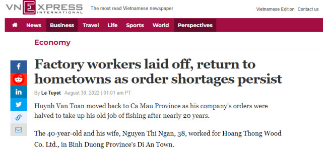 财联社9月2日讯(编辑 潇湘)数十年一遇的高通胀、史无前例的能源危急——近期,合法西欧大众被超市货架上的高物价和可怕的电费账单吓到两腿发软之际,一阵由环球经济大概深陷阑珊掀起的“北风”,也正开始席卷向迢遥的亚洲…… 迩来,环球部门制造业工厂遭遇“订单荒”的报道不时出现,而这一幕在东南亚的代工中心越南,也正开始变得越来越常见。只管在本年一季度,不少越南工厂号称订单“火爆”到可以一起排到年底,但在短短几个月后,环境似乎正发生着玄妙的变化! 据越南媒体Vnexpress报道,自从下半年以来,许多越南制造业工厂吸收到的订单显着出现镌汰,加之此前一段时间生产线和雇用的扩张速率过快,导致现在不少工厂不得不缩减生产时间,并安排工人轮替休假。 而随着收入因欺压休假下工时不敷而锐减,在客岁疫情高峰期曾经一度出现的越南工人“返乡潮”,也正在某些地区沉寂上演。乃至于这一次,对越南部门低端制造业而言,外围市场合遭遇的“隆冬”,大概要来得比当初的疫情更为可骇…… (Vnexpress:由于订单荒,工厂工人面对赋闲返乡) 据越南统计总局8月29日的数据,2022年8月越南货品出口总额预计为333.8亿美元,环比增长9.1%,有望暂时扭转上月环比降落7.7%的颓势。 不外,越南官方媒体越通社也提到,预计2022年剩余几个月,天下经济将面对诸多困难,乃至一些告急经济体大概陷入阑珊。许多国家和地区的通胀率继承大幅上涨,将影响到非必须品的消耗,导致包罗越南在内的各国需求降落。 虎落“平阳”? 位于越南东南地区的平阳省,是越南均匀工资最高的地区。该省也堪称是越南最具经济竞争力的省份——其辖区拥有29个工业区,12个大型工业园,国际化和基建水平为越南工业都会的范例榜样。 但正是这一越南经济的龙头地区,眼下感受到的寒意似乎也更为砭骨。 据平阳劳工团结会表现,自第二季度以来,该地区已有330多家制造企业遭遇困难,不得不裁人、停息条约、给工人无薪假。受影响的员工总数凌驾41000人。 该团结会法律政策部副主任Dang Tan Dat表现,一些告急出口到欧盟和美国的商品,如木制品、纺织品、鞋类和电子产物等行业,正面对巨大的挑衅。他表现,许多工厂的订单镌汰了30-50%,制制品无法出口,收入大幅降落。 他增补称,当这些企业的工人失去工作时,他们许多会选择打包回故乡,由于400-500万越南盾(约合1170-1470元人民币)的根本工资很难让他们在都会里生存下去。 现年40岁的打工族Huynh Van Toan迩来就回到了故乡金瓯省,由于他此前就职的公司Hoang Thong Wood的订单镌汰了一半。自5月份以来,随着业务放缓,该公司不停在以一半的产能运营,而且不再要求员工加班。 固然公司乐意继承付出他们的根本工资,但Toan和同在该工厂工作的老婆的总收入,仍大幅镌汰了近700万越南盾(约合2060元人民币)。由于他们的收入仅够委曲维持生存,这对夫妇终极决定只留下一人,而别的一个人则先带着他们的儿子回故乡。如果该公司的订单继承降落,他们百口都将归去。 Toan表现,“在农村你不消付房租。如果你饿了,也能直接在地里摘菜吃。” 据该公司人力资源总监Duong Quang Hiep表现,本年年初,该公司订单敏捷增长,当时他们乃至花了30多亿越南盾前往差异省份雇用了近1500名员工。如果这些员工住得很远,还会为他们垫付机票。本年4月,由于需求激增,其贸易同伴乃至会派卡车直接到工厂等候提货。 但不到一个月后,订单量就开始出现骤减。“我们花了许多时间和款项雇用员工,但现在我们不得不继承他们正在离开的究竟,”Hiep称。 据他先容,辞职的工人大多返回了故乡,由于偕行业的木制品工厂险些找不到工作,许多企业由于没有订单已经倒闭。 平阳劳工团结会副主席阮黄宝陈表现,该省的工会将很快与劳工管理机构和谐,为农夫工探求新的工作时机。她增补称,工会已经下令企业敏捷落实为工人预备的一揽子支持方案。 订单危急 据越南胡志明市贸易协会称,在本轮制造业“订单荒”中,电子、纺织、鞋类,木柴加工等劳动麋集型行业受到美国和欧洲订单镌汰的打击最大。 越南纺织服装协会副秘书长Tran Thi Tuyet Mai指出,本年年初,企业的订单许多,能找到符合工人则很少。但二季度随着俄乌辩论发作加上油价上涨等因素的发酵,环球范围内人们的购买风俗开始发生变化。各大品牌开始镌汰订单数量,这意味着工厂不得不让工人休假。 Nguyen Phuoc制鞋生产商市场主管Nguyen Huu Phuoc先容称,之前该公司每每都会提前一到两个季度接到订单,但现在的订单只会提前2-3个月。 他表现,固然上半年的贩卖令人满意,但预计9月和10月的订单将继承镌汰。现在许多制鞋企业只能“委曲生活”,订单不像再像以往那么富足了。由于需求急剧降落,部门互助同伴乃至取消了订单。 平阳省皮革鞋业协会主席Nguyen Quang Vu也证实,8月份、9月份和10月份的鞋类产物订单与客岁同期相比镌汰了30%。 在电子产物范畴,上月早些时间三星电子越南工厂的员工也曾爆出,随着环球消耗者付出降落导致库存积蓄,三星电子一度缩减了其在越南的大型智能手机工厂的产量。“我们每周只工作3天,一些生产线正在调解为4天工作制,而不是从前的6天工作制,固然不再须要加班。” 数据表现,越南1-7月手机组件产量的同比增速相比1-6月降落约1个百分点,7月手机组件产量的同比增速相比6月降落了约16