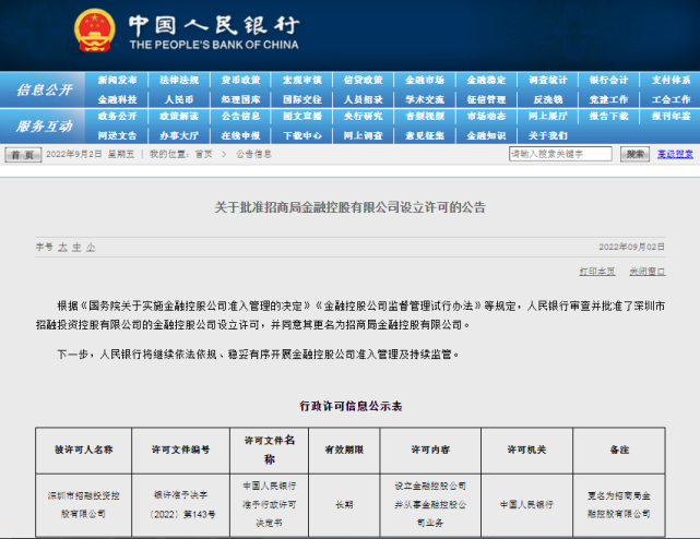 记者9月2日从中国人民银行获悉,人民银行查察并答应了深圳市招融投资控股有限公司的金融控股公司设立答应,并同意其更名为招商局金融控股有限公司。 (截图来自中国人民银行网站) 为推动金融控股公司规范发展,2020年国务院印发了《关于实行金融控股公司准入管理的决定》,人民银行也同步发布了《金融控股公司监督管理试行办法》。2022年3月,人民银行答应了中国中信金融控股有限公司(筹)和北京金融控股团体有限公司的金融控股公司设立答应。7月中旬,中国中信金融控股有限公司举行了创建大会。 人民银行表现,下一步将继承依法依规、稳妥有序开展金融控股公司准入管理及连续羁系。(记者吴雨、孙飞) |