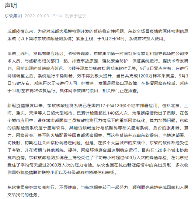 中国基金报 泰勒 昨夜,成都核酸体系瓦解,不少市民冒雨列队仍等不到核酸,微博相干词条“成都核酸体系瓦解”刷屏,而核酸体系供应商“东软”也被骂上热搜。 不少明白昨夜举起手机,以为是信号不好。 本日,成都官方出来致歉,而东软也回应了,说体系没题目,是网络题目。不知道到时间移动联通电信,哪家运营商出来接锅? 东软回应成都核酸体系非常 3日下战书,东软团体回应成都核酸体系卡顿,声明称,成都疫情以来,为应对成都大规模检测并发的体系稳固性题目,东软全场景疫情病原体检测信息体系(以下简称东软核酸检测体系)告急上线,于9月2日04时,体系初次投入利用。体系上线后,发现有相应耽误、卡顿等征象,东软团体第一时间构造专家组和服从现场的公司技能职员,与成都市相干部门一起,排查变乱缘故因由,强化安全防护,包管体系运行。 据技能专家研判,现在出现的体系相应耽误、卡顿等征象与核酸检测体系软件无关。9月3日零点左右,在举行网络调解之后,体系运行安稳顺畅,服从得到极大提拔,当日共完成1200万样本收罗量。9月3日13时左右,体系再次无法举行访问,经排查,发现是网络出现故障,在规复网络毗连后,体系于14时左右再次规复运行。详细网络故障的缘故因由,相干部门正在排查。 东软团体称,新冠疫情发作以来,东软核酸检测体系已在国内17个省120多个地市摆设应用,包罗北京、上海、重庆、天津等生齿超大型都会,已累计检测凌驾140亿人次,为阻断疫情做出了贡献。在各个都会应用中,很多都会都面临全员核酸检测压力环境下的重新网络优化、算力增强题目。东软的核酸检测体系属于应用软件,其可否顺畅运行与核酸码等相干应用体系、配景的服务器、算力、网络带宽、以致防火墙设置等因素都精密相干,而这些体系并非由东软提供,当快速摆设、切换时,初期通常谋面临和谐稳固题目。但是,在多个大型都会的实战中,东软的软件都担当住了查验,并在短期与其他体系、硬件、网络环境磨合后到达稳固运行,现在在120多个都会资助抗击疫情。东软核酸检测体系在上海担当住了均匀每小时凌驾600万人次的峰值查验,在北京担当住了均匀每天凌驾2000万人次的压力查验。东软也因在抗击新冠疫情中的突出贡献,多次收到国务院疫情联防联控小组以及各级当局的感谢信和表扬。 东软团体会继承负责前行、不辱任务,与各地相干部门一起积极,顺遂而光荣地完成国家和人民交给我们的任务。 别的,东软团体是A股上市公司,市值130多亿。 其半年报提到,基于场景化的地区化办理方案为国家医学中央、地区医疗中央建 设赋能,为 200 多家卫健委,此中包罗国家卫健委、21 个省级卫健委、72 个地市级卫健委提供服务。克制陈诉期末,在连续的疫情防控工作中,东软都会级核酸检测办理方案全场景疫情病原体检测信息体系依附着高可靠性、高服从的服务上风,已应用于 17 个省 120 个地市,累计检测 104 亿人次。 成都疫情防控指挥部 相干负责同道致歉 9月1日,成都市新型冠状病毒肺炎疫情防控指挥部发布《关于在全市开展全员核酸检测的告示》,决定自2022年9月1日至9月4日在全市范围内开展全员核酸检测。9月2日晚,核酸检测体系出现非常,导致采样列队时间过长,核酸检测进度迟钝,给市民群众带来困扰和未便。 本日,记者就市民关心的题目,采访了成都市新型冠状病毒肺炎疫情防控指挥部相干负责同道。 Q1 昨晚全员核酸检测期间,核酸检测体系为什么出现非常环境?采取了哪些处置惩罚步伐? A 昨天下战书至晚上,全市核酸检测体系出现非常环境,导致检测进度迟钝。雨夜风凉,群众长时间列队,一线检测职员辛劳服从,我们感同身受、焦虑万分、深感愧疚,老实继承社会品评,向全市人民表现最朴拙的歉意,也感谢市民群众的充实明白和大力大肆支持。 9月2日17时30分左右,我市核酸检测体系因对短时超大并发量预估不敷,导致体系出现卡顿题目。故障发生后,我们立刻构造专业技能团队与承建商一起排查缘故因由,积极抢修,体系在增长多台服务器、优化关键参数设置后渐渐规复,但还存在不确定性,我们正在积极加以办理。下一步,我市将采取错峰核酸检测采样、强化体系运行监控、增强题目相应等步伐,积极保障核酸检测安稳顺遂举行。 Q2 为保障市民正常生存,哪些疫情防控步伐须要临时调解? A 根据现实环境,我们告急调解了9月3日相干步伐。一是出行保障方面,市民群众及保供职员持48小时核酸阴性证实以及收支登记卡、电子通行证等,可以收支小区(院落)、乘坐公共交通。二是市民就医方面,可凭48小时核酸阴性证实看病就医,各医疗机构严酷预检分诊,医护职员在做好自身防护的条件下,引导群众有序就医。三是弟子入学方面,成都市教诲局已实时向各学校下发告急关照,9月2日因核酸检测体系非常,没有实时举行核酸检测的弟子,不影响本年秋季入学,待开学时间确定后,我们会提前告知家长弟子有关学校疫情防控的要求。 Q3 为保障第三轮核酸检测顺遂举行,您另有什么发起给市民朋侪? A 我们再次向广大市民朋侪表现歉意,对各人的明白和支持表现衷心感谢。从现在环境来看,全员核酸检测采样人流量大,检测任务重,请广大市民朋侪按所在街道、镇、社区、村的关照,分时段错峰有序到场核酸检测,我们会安排弟子、儿童、老人等特殊人群以及到场都会运行