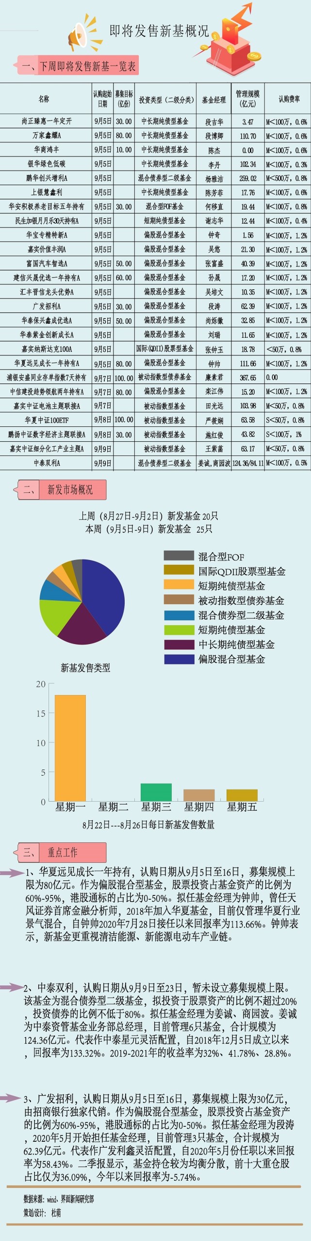 本周,受宁德期间连跌8日的影响,创业板指数走出八连阴。不外,恐慌性下跌后,大概将迎来较好的布局时机。 下周,共有25只新基金等候发行,此中仅偏股混淆型基金就有10只,中原、嘉实等均有权益新基发行。 |