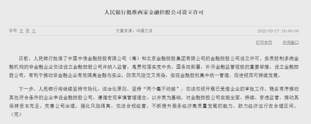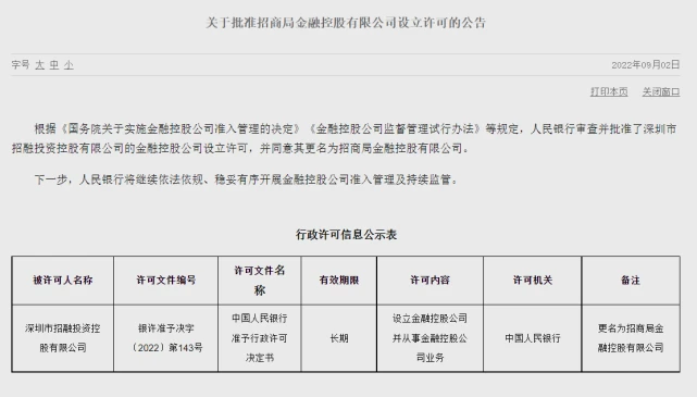 每经记者:赵景致 每经编辑:马子卿 9月2日,中国人民银行发布公告称,根据《国务院关于实验金融控股公司准入管理的决定》《金融控股公司监视管理试行办法》等规定,人民银行查察并答应了深圳市招融投资控股有限公司的金融控股公司设立允许,并同意其更名为招商局金融控股有限公司。 资料泉源:央行官网 下一步,人民银行将继续依法依规、稳妥有序开展金融控股公司准入管理及连续羁系。 据此前消息,人民银行于2021年12月31日受理深圳市招融投资控股有限公司设立金融控股公司的申请。 招商金控体现,作为招商局团体(简称“招商局”)的全资子公司,招商金控将全面落实羁系要求,并以此为契机,增强风险管理、金融科技、财产管理“三个本领”建立,致力于实现高质量发展,显现央企金控风貌,打造创新引领、协同驱动、特色光显、国内领先的金融控股团体。 招商局金控获批据人民银行9月2日消息,央行已查察并答应了深圳市招融投资控股有限公司的金融控股公司设立允许,并同意其更名为“招商局金融控股有限公司”。 资料泉源:招商局官网 资料表现,招商局是中国民族工商业的先驱,建立于1872年洋务运动时期,本年是招商局150周光阴诞。招商局是中央直继承理的国有告急骨干企业,总部位于香港。告急业务会合于交通物流、综合金融、都会与园区综合开辟三大核心财产。招商局综合金融业务涵盖银行、券商、资管、保险、多种金融等范畴,已形成“4+N”业务布局。 据悉,招商金控前身为招商局团体内部的金融古迹部,与1999年创建的招商局金融团体“两块牌子,一套人马”。今后2018年,招商局团体创建招商局金融古迹群/平台,进一步优化对金融板块成员企业的管控模式。2021年12月,招融投资正式向央行提出设立金融控股公司行政允许申请。9月2日央行答应招商局金融控股有限公司设立允许,成为国务院国资委体系内首家央企金控。 记者相识到,在设立允许获批后,招商局原“金融古迹群/平台”官网名称已变动为“招商金控”。 招商金控官网表现,该公司羁系口径下风险并表及参股告急性机构总计670家,此中,直接持股管理的告急从事金融运动的机构约莫有10家,包罗:招商局通过全资子公司招商局汽船(SH601872,股价7.25元,市值587.8亿元)和招商金控合计持有招商银行(SH600036,股价34.32元,市值8655亿元)27.86%股份;持有招商证券(SH600999,股价13.16元,市值1144亿元)44.17%股份;持有招商仁和人寿33.33%股份。业务布局涵盖银行、券商、资产管理、保险等多个金融范畴。 根据招商局官网提供的数据表现,本年上半年,招商局团体金融业务净利润733亿元,同比增长5.7%;总资产规模10.4万亿元,管理资产规模凌驾19万亿元。 招商金控体现,作为招商局团体的全资子公司,将全面落实羁系要求,并以此为契机,增强风险管理、金融科技、财产管理“三个本领”建立,致力于实现高质量发展,显现央企金控风貌,打造创新引领、协同驱动、特色光显、国内领先的金融控股团体。 为国内第三张金控牌照当前,金融控股公司准入管理和羁系工作正在稳步推进。 除答应招商局金融控股有限公司设立允许外,本年3月,人民银行还答应中国中信金融控股有限公司(筹)和北京金融控股团体有限公司的金融控股公司设立允许。此中,中国中信金融控股有限公司已于本年3月24日正式创建。 资料泉源:央行官网 据悉,金融控股公司是指依法设立、控股或现实控制两个或两个以上差异范例金融机构,自身仅开展股权投资管理、不直接从事商业性策划运动的有限责任公司或股份有限公司。 2020年9月,《国务院关于实验金融控股公司准入管理的决定》和《金融控股公司监视管理试行办法》公布。根据文件要求,在我国境内的非金融企业、天然人以及经承认的法人控股大概现实控制两个大概两个以上差异范例金融机构,具有规定情况的,应当向中国人民银行提出申请,经答应设立金融控股公司。 文件从注册资源,股东、现实控制人,董事、监事和高级管理职员,增补资源本领,以及构造机构和风险管理、内控制度等方面临金融控股公司提出明确的准入要求。 资料泉源:央行官网 本年3月份,央行体现,实质控制多类金融机构的非金融企业依法设立金融控股公司并纳入羁系,是贯彻落实党中央、国务院摆设,补齐金融羁系短板的告急办法。设立金融控股公司,有利于推动非金融企业有用隔离金融与实业,防范风险交织感染,实现金融股权会条约一管理,促进规范可连续发展。 人民银行体现,下一步,人民银行将继续依法依规、稳妥有序开展金融控股公司准入管理及连续羁系。 逐日经济消息 |