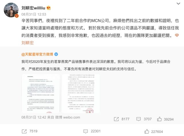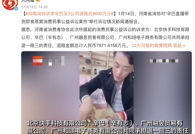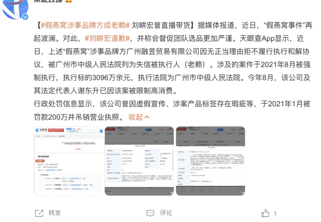 糖水燕窝变乱本以为会已往,没想到因辛巴的“一纸诉状”再起波涛。 而该变乱的始作俑者假燕窝涉事品牌方始终处于舆论的第二梯队,事发后极其低调,而现在根据第三方信息平台表现,涉事品牌方公司已经成为老赖。 9月5日,根据信息平台表现,该公司因涉嫌虚伪宣传以及涉案产物标签存在瑕疵等标题,已于2021年1月被罚款200万并吊销业务执照。 而且根据9月2日披露的信息,“假燕窝”涉事品牌方广州融昱贸易有限公司因无合法来由拒不推行实行息争协议,被广州市中级人民法院列为失信被实行人(老赖)。8月19日,该公司以及法人谢东升被表现高斲丧。 现在案件已经在2021年8月被欺压实行,公开信息表现,仅补偿款该品牌方便要付出3035万元,算上其他的累计为3096万元。 纵然被吊销了业务执照,该公司仍旧官司缠身,信息表现2022年7月15日仍旧有新的备案信息。 别的这家公司还涉及多起网络购物条约纠纷,被斲丧者告状。 此前,河南消协会曾代表斲丧者诉求辛巴及3家公司退赔近8000万元,最初还盼望封禁了辛巴的带货账号。过后辛巴也是积极地负担责任,事变处置惩罚得还算满足。 而在克日的一场直播中,辛巴直接发长文往事重提,而且透露刘畊宏等明星艺人也曾卖过同款燕窝,乃至直言一些平台有包庇举动。 之后,刘畊宏夫妇和经纪公司发文表现:对于我先前相助的公司选品不敷严谨,导致信托我的斲丧者受到陵犯,我感到非常歉仄。而关于此变乱的退赔将会不停存在。 明星带货本就是对寻常偕行是一次降维打击,加之斲丧者的维权意识日益增强。在货品的品格把关也应该更器重,为了斲丧者的信托要更加地爱惜自己的羽毛。 |