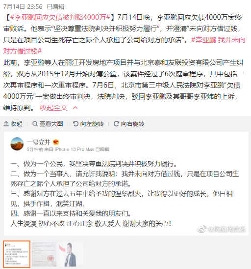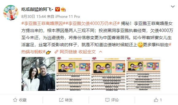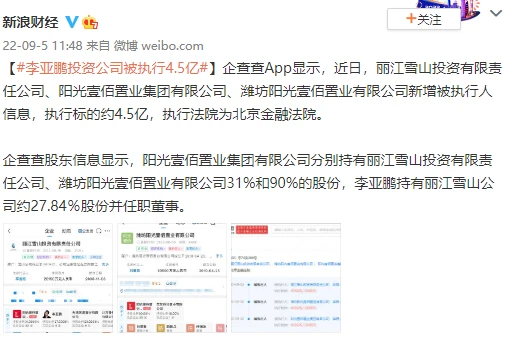 9月5日,有媒体发现王菲前夫李亚鹏名下公司被实验4.5亿,实验法院是北京金融法院,时间是2022年9月2日。 股东信息体现,阳光壹佰置业团体有限公司分别持有丽江雪山投资有限责任公司、潍坊阳光壹佰置业有限公司31%和90%的股份,李亚鹏持有丽江雪山公司约27.84%股份并任职董事 李亚鹏2013年出演《单纯的年代》后淡出演艺圈,从娱乐咖变成商咖,只痛惜贸易发展不如星途顺遂,投资的地产项目未及预期还和合资人发生纠纷,2015年12月开始对簿公堂,李亚鹏被判败诉需赔付4000万及上万万的利钱费用,厥后李亚鹏和哥哥上诉,到本年7月法院驳回,维持原判。 坊间有消息称,李亚鹏不停拖欠这笔账,其时乃至出现灌音,在灌音中称“我们已经无路可走了,你们须要我怎样都可以,须要我跪下都可以...”李亚鹏方面发声明否认,指语音信息被恶意剪辑、断章取义,会接洽对方提供完备的灌音信息。 本年7月再遭败诉后,李亚鹏体现会恭敬法院讯断积极推行,未曾向对方借过钱,只是在项目公司生死生死之际个人负担了公司给对方的答应。 实在从本年开始,李亚鹏公司就多次被实验。1月被实验186万,2月被实验200万,3月已共计被实验500万,到了9月,被实验4.5亿,数量直接翻了百倍。 固然阛阓失意但李亚鹏在情场却马到乐成,本年3月,李亚鹏公布与32岁女友海哈金喜完婚生下女儿,这对相差18岁的情侣即便不被看好,但李亚鹏敢爱敢恨,中年得女后又心血来潮想公布即将回归演艺圈,透露用十天写了脚本,大概来岁会去筹拍。 究竟上,李亚鹏当年顶峰时期退圈成为很多影迷意难平的事,加之他与王菲仳离后还是朋侪,不停视继女窦靖童如己出,在大众心中留下不错的口碑。上个月尾,另有媒体曝光,两人仳离是三观差异,李亚鹏是“投资黑洞”,拖欠4000万至今未还,王菲当年主动提出仳离。 李亚鹏与海哈金喜来今后就开通了个人账户,不时分享布满诗意的人生,大概人到中年妻娇女幼,是很多人的抱负,半个月前,另有媒体拍到一家三口外出的镜头,生存不受影响。 不外人生没有完善无缺,令人费解的是,李亚鹏的生存质量明显很高,还能筹钱去拍影戏,却为什么迟迟不还这笔钱?以至于现在被实验了十倍的金额,成为各人口中的“老赖”,可谓得不偿失。 |